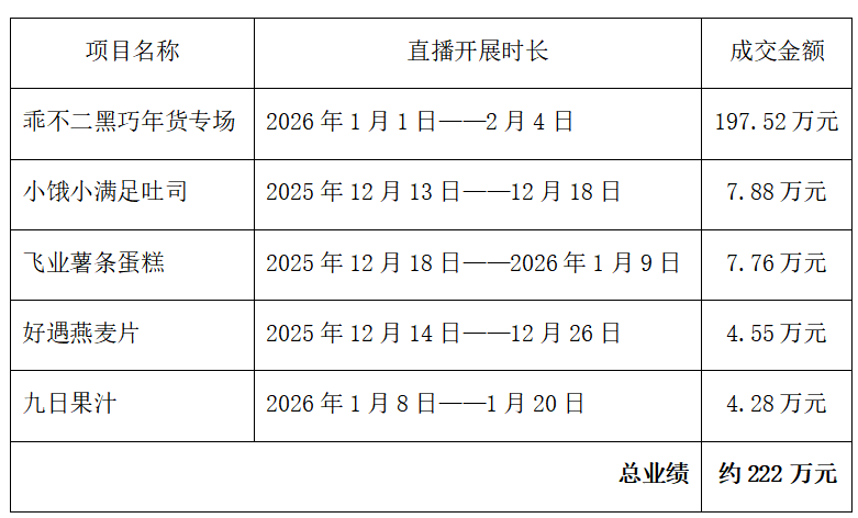 训练营自2025年11月29日正式开营,经过系统专项培训后,于12月13日启动正式开播,首期合作于2月初圆满落幕,累计吸纳我院5名毕业班学生入驻企业实习,深度参与直播全流程运营,为未来就业筑牢实践根基。历经两个多月的实战打磨,我院学子以扎实的专业能力,创下喜人的实战业绩,用成果彰显产教融合育人价值。合作期间,该项目先后承接多个产品直播带货,直播总销售额超220万元。具体业绩如下: