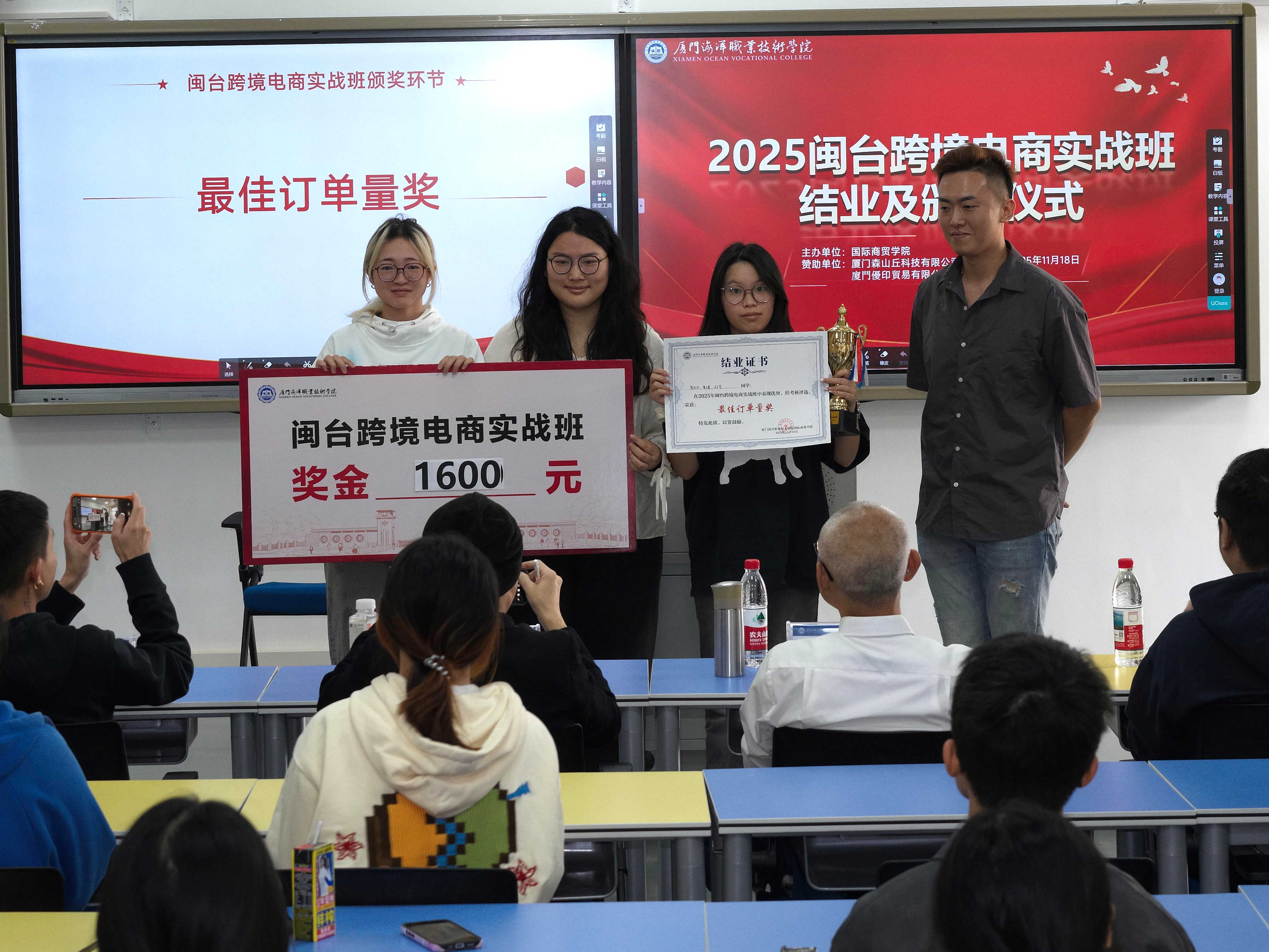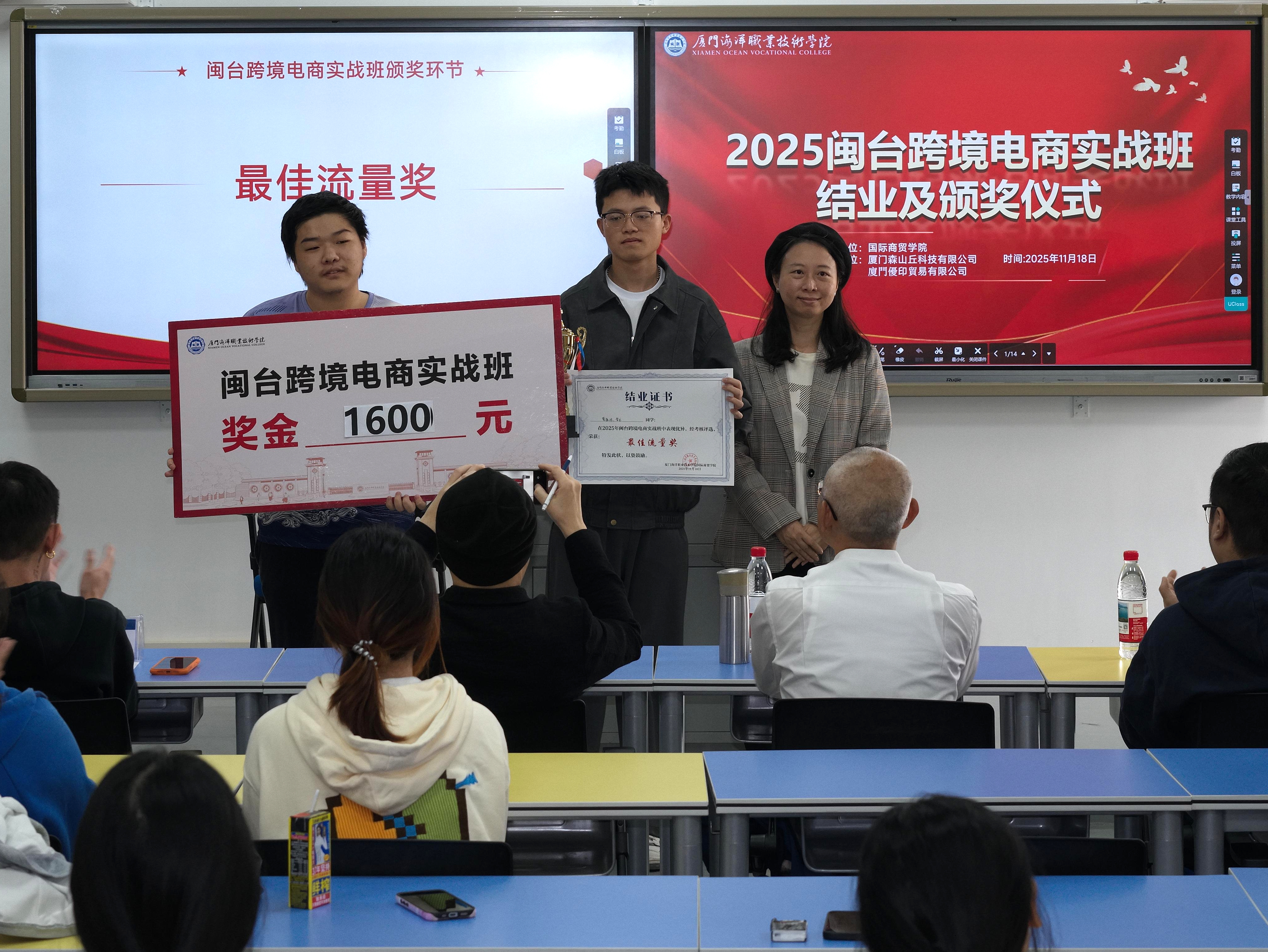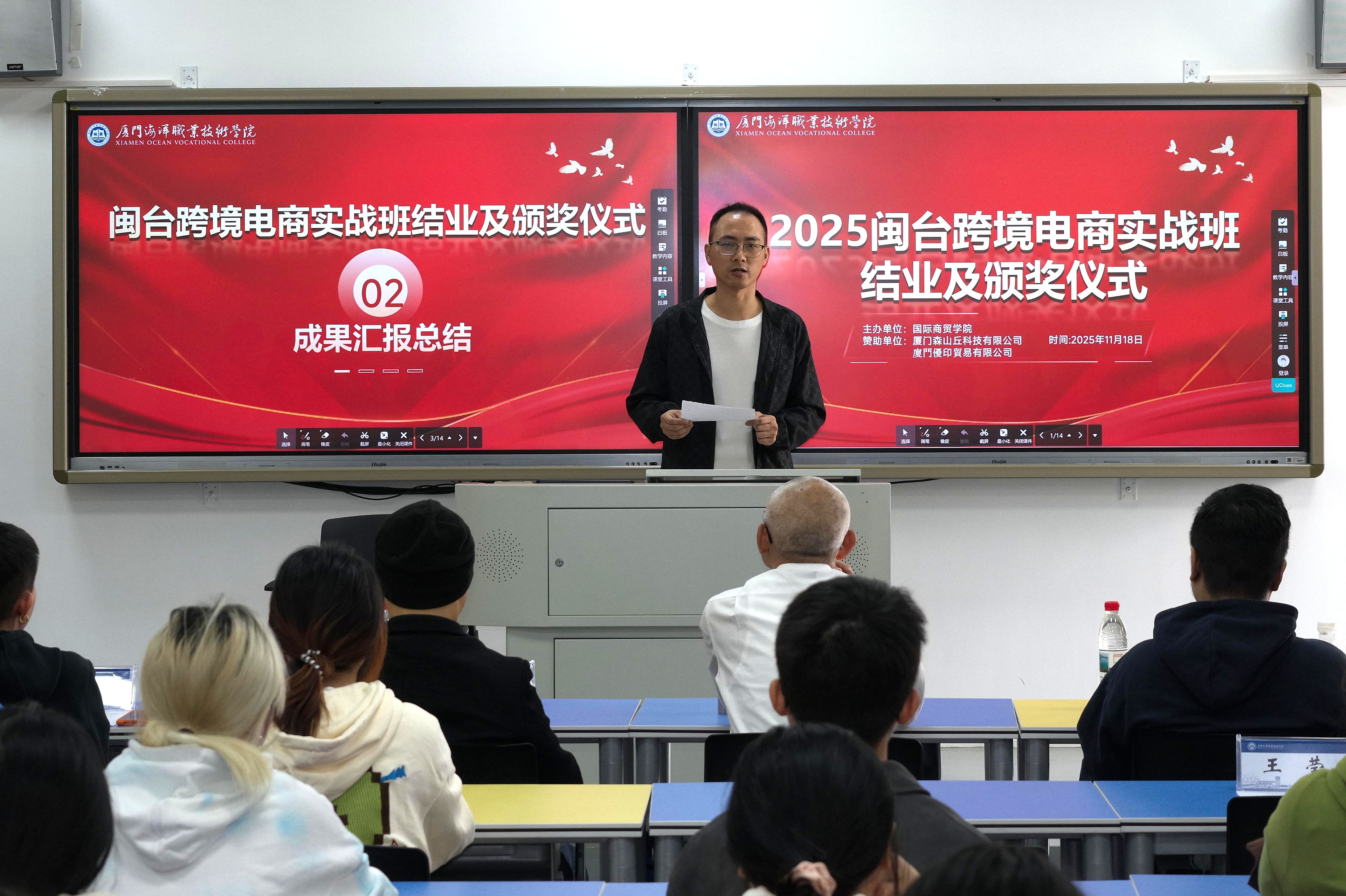 11月18日下午,由国际商贸学院和厦门森山丘科技有限公司、厦门优印贸易有限公司共同举办的“2025闽台跨境电商实战班”结业暨颁奖仪在翔安校区智慧教室3501举行。学院党总支书记王火灵,企业代表颜浚腾、杜梓华、郭威廷、何宗育、苏得维及项目全体师生出席。