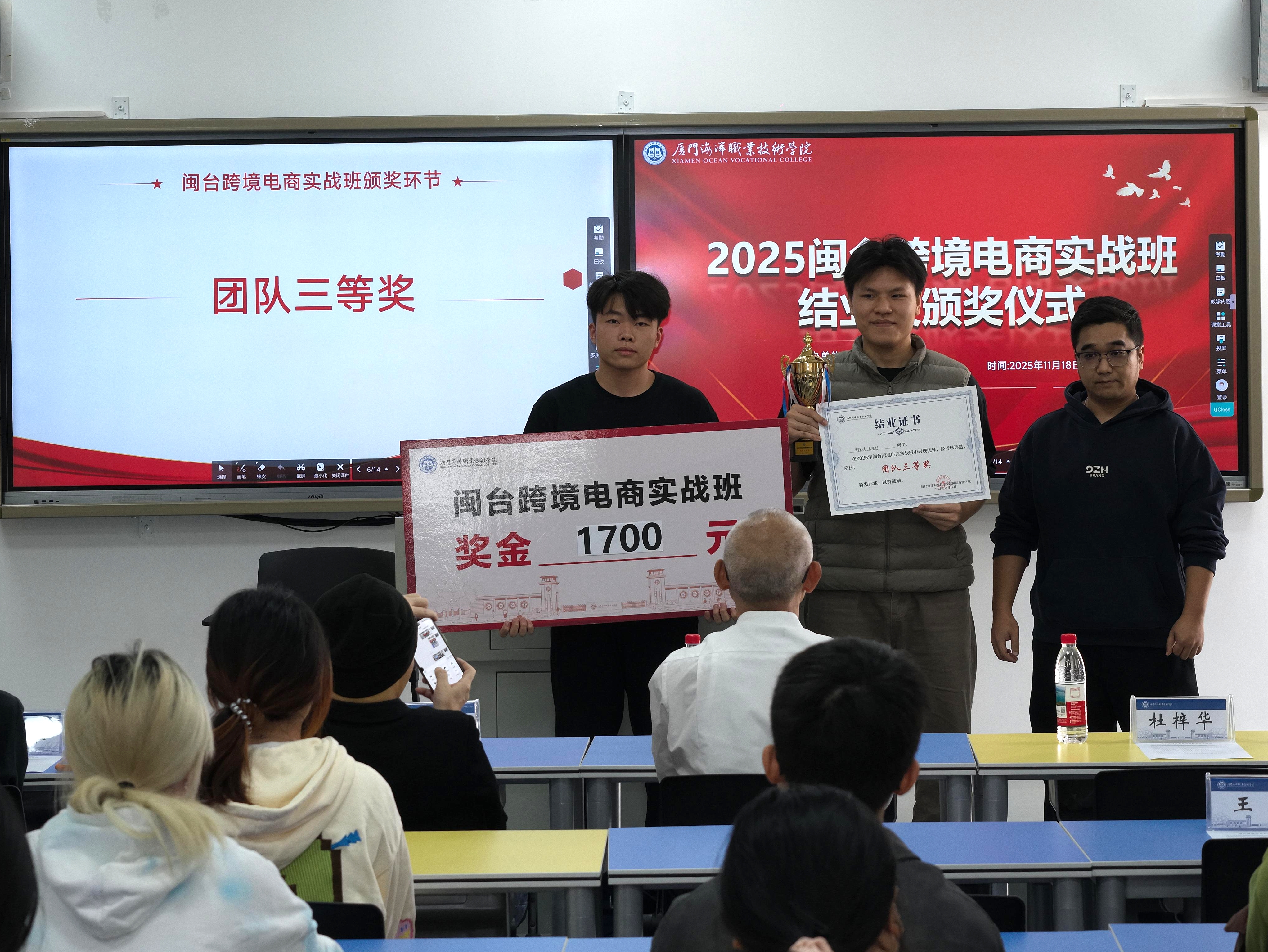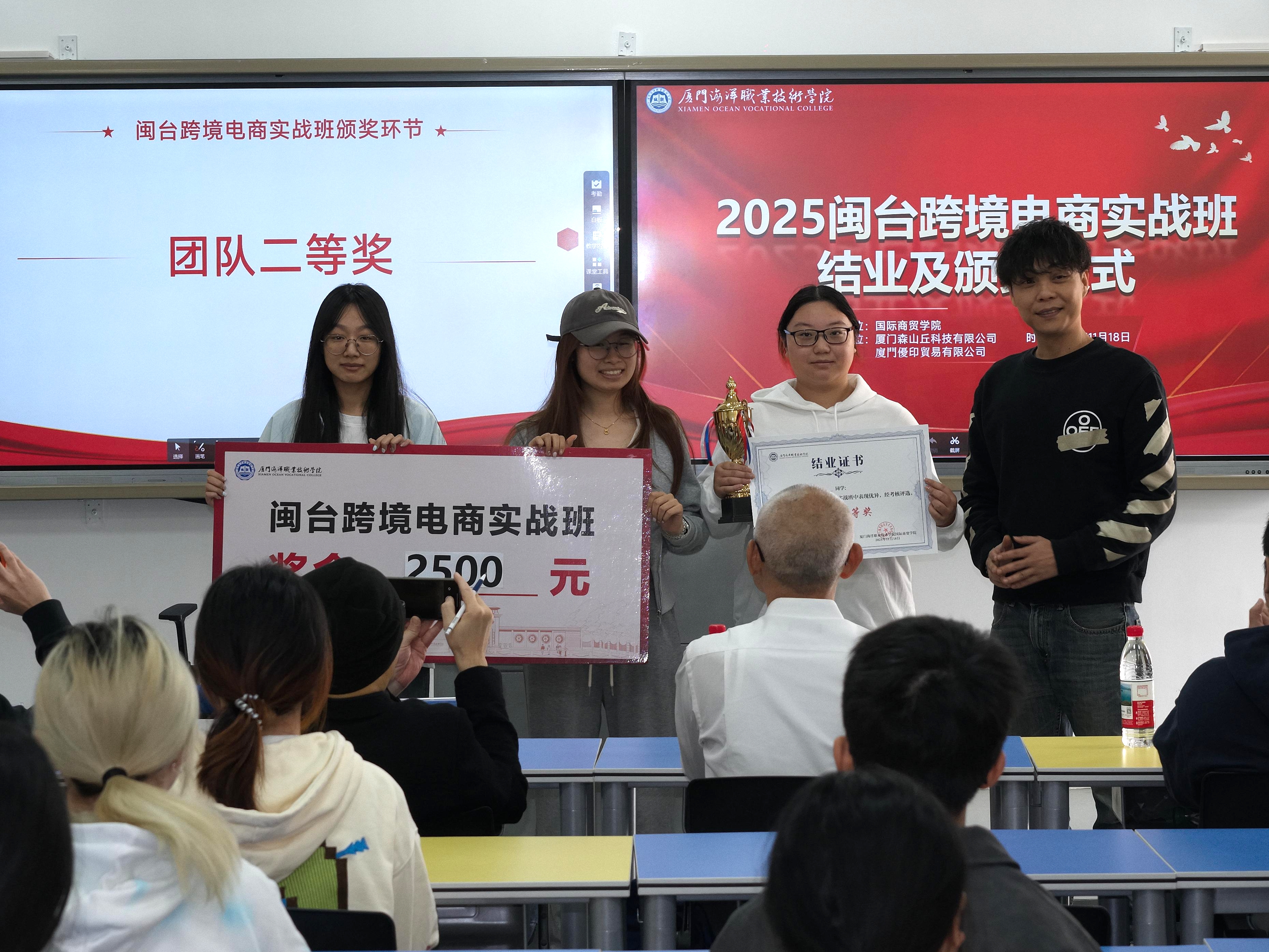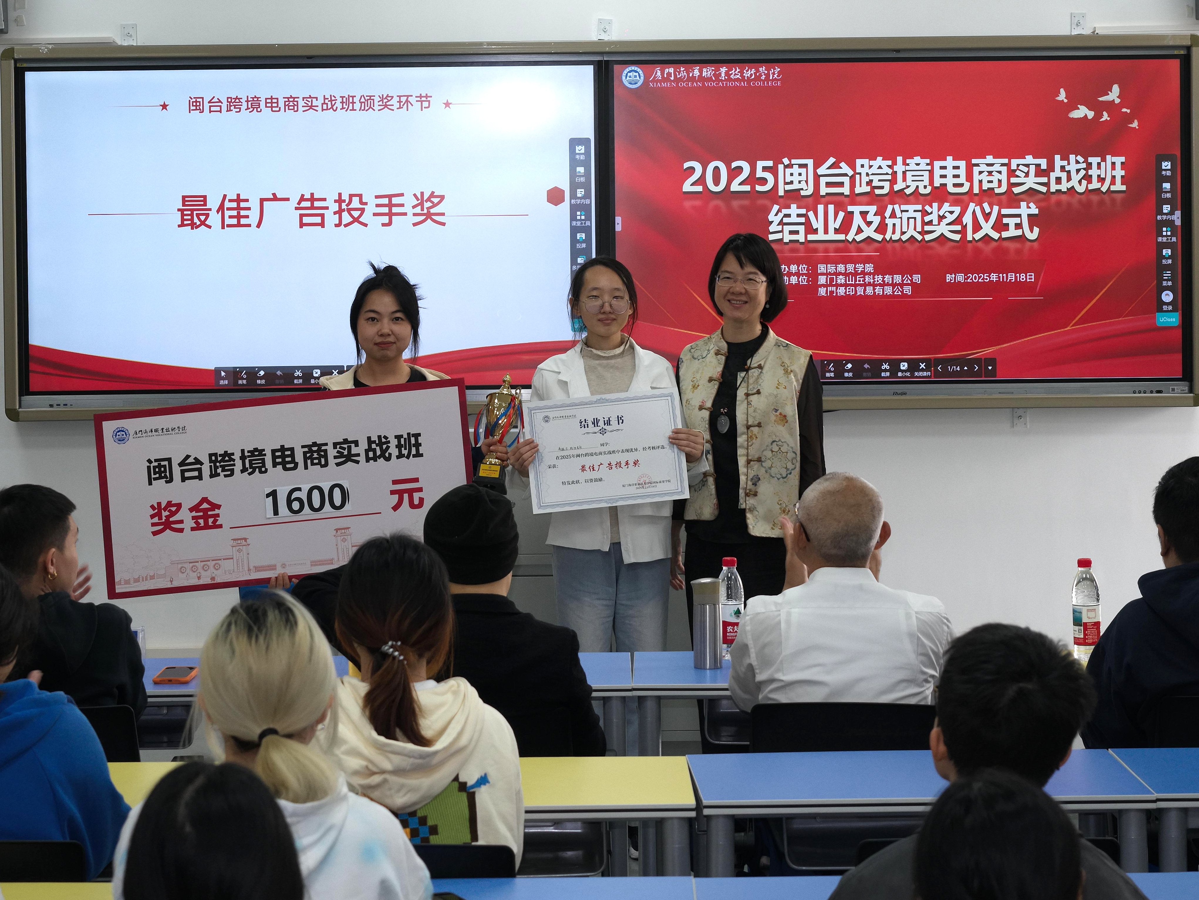 11月18日下午,由国际商贸学院和厦门森山丘科技有限公司、厦门优印贸易有限公司共同举办的“2025闽台跨境电商实战班”结业暨颁奖仪在翔安校区智慧教室3501举行。学院党总支书记王火灵,企业代表颜浚腾、杜梓华、郭威廷、何宗育、苏得维及项目全体师生出席。