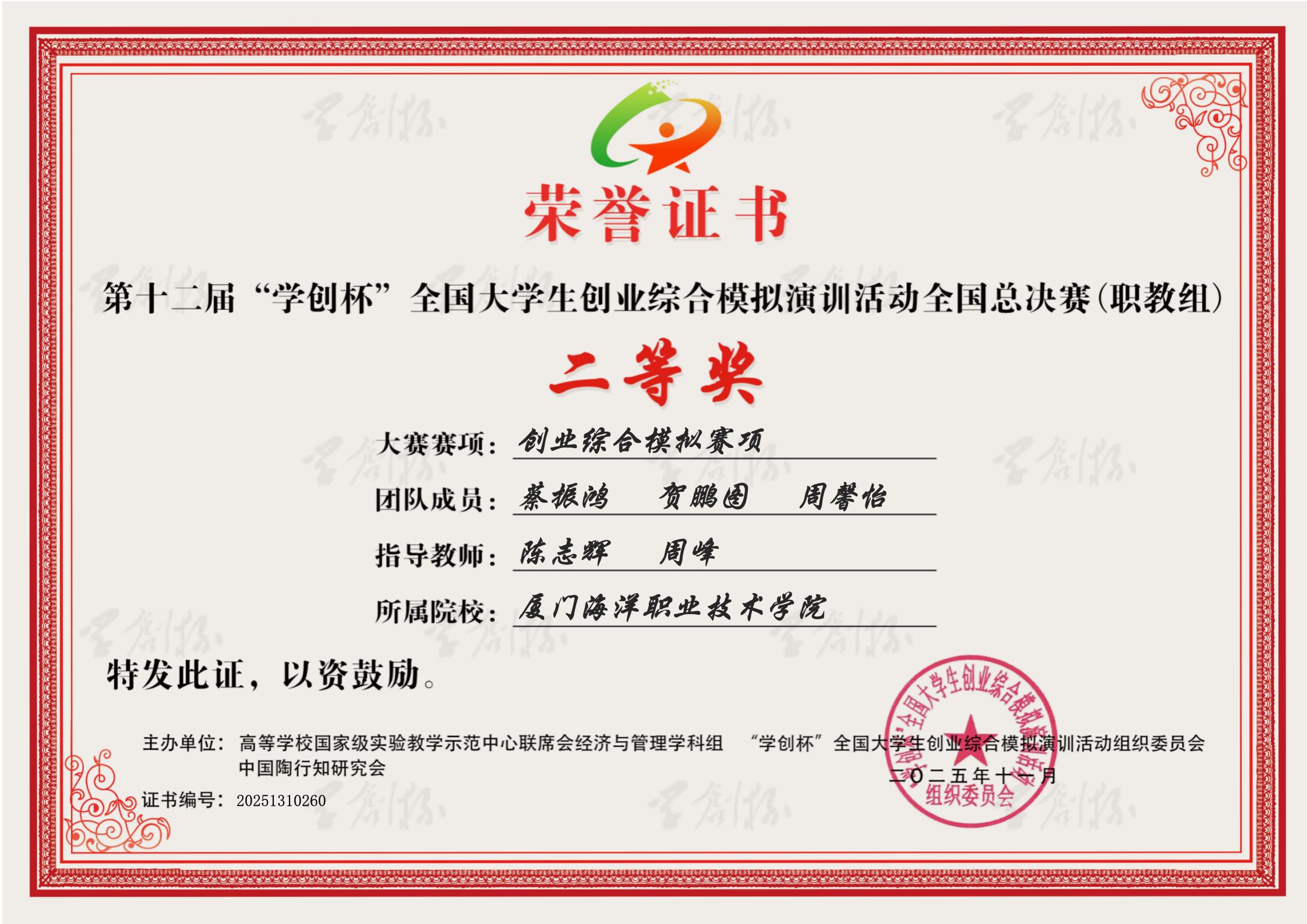 近日,第十二届“学创杯”全国大学生创业综合模拟演训活动全国总决赛传来捷报,国际商贸学院代表队不负众望、勇创佳绩,其中由商务英语专业杨蓉、跨境电商专业徐心悦与信息工程学院陈昆翔组成的团队斩获一等奖,跨境电商专业蔡振鸿、国际商务专业周馨怡及贺鹏图组成的团队荣膺二等奖,充分展现了学院“岗课赛证”融合育人模式下的双创教育成果与学子风采。