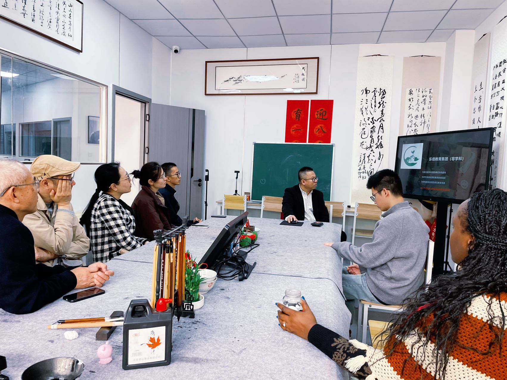 王火灵一行在机构负责人李福长的带领下实地参观了乐倍艺术培训中心的教学场地、设施设备与课程成果展示区,详细了解中心在艺术教育、体育教育、科技教育、劳动教育、研学教育、外教英语、数智化教学等板块的课程体系、运营模式及师资建设情况。