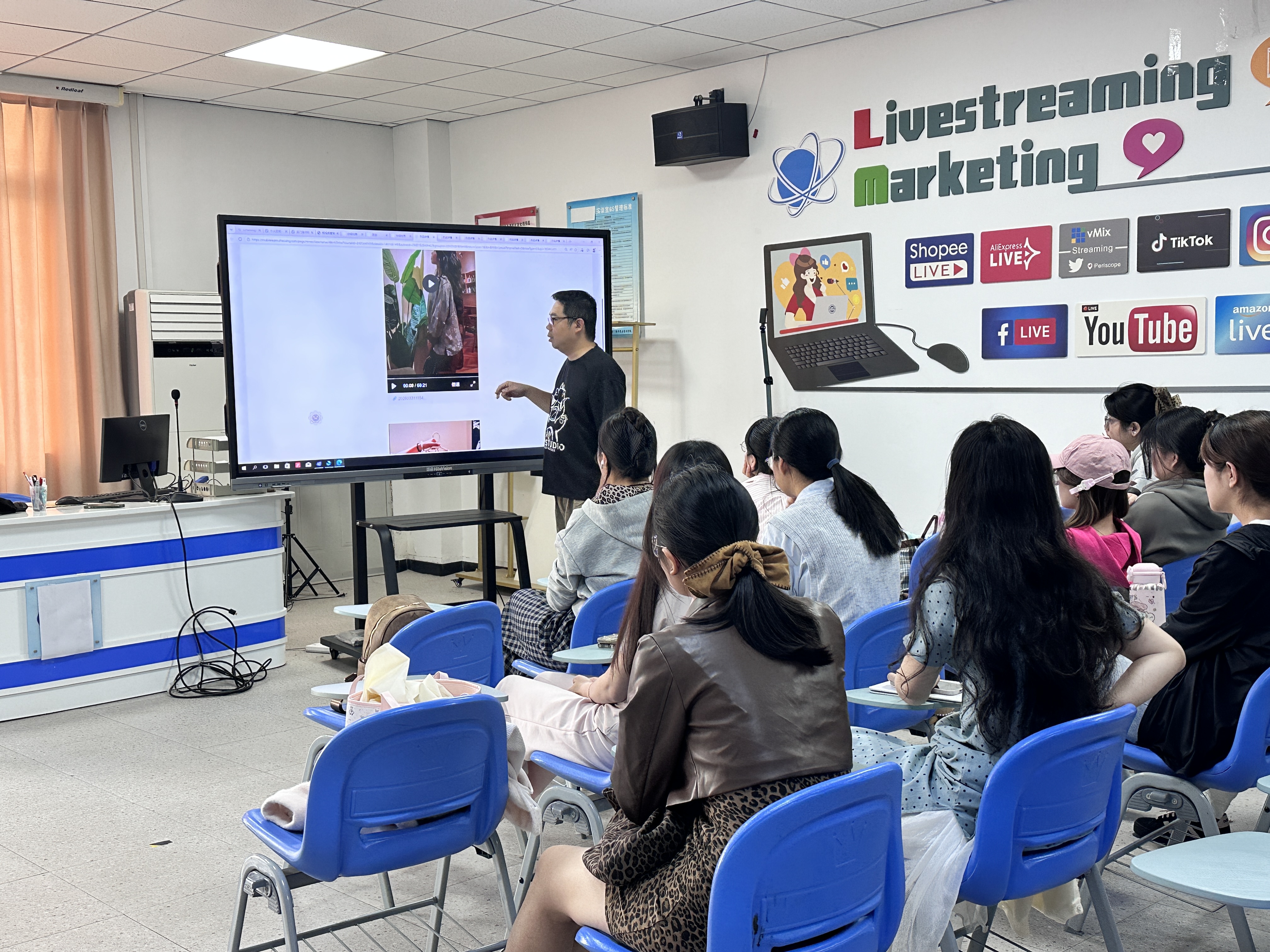 在直播 3241 班《短视频营销技能提升》课堂上,杨丹男结合服饰电商行业的实战案例,从短视频内容策划、镜头语言运用、爆款逻辑拆解等多个维度展开分享。他以服饰类短视频为例,通过对比不同拍摄视角、剪辑节奏与呈现形式的效果差异,向同学们讲解如何精准捕捉产品卖点、打造有吸引力的内容,同时分析当下主流平台的流量规则与用户偏好,引导同学们跳出“只拍产品”的思维误区,学会用营销思维打造能打动用户的短视频内容。现场还播放了行业内的优秀案例与常见误区视频,带着同学们逐帧拆解镜头设计、运镜技巧和画面构图,让大家直观理解“好看的画面”与“能卖货的画面”的区别,为同学们后续的短视频创作与直播内容运营提供了清晰的方向。