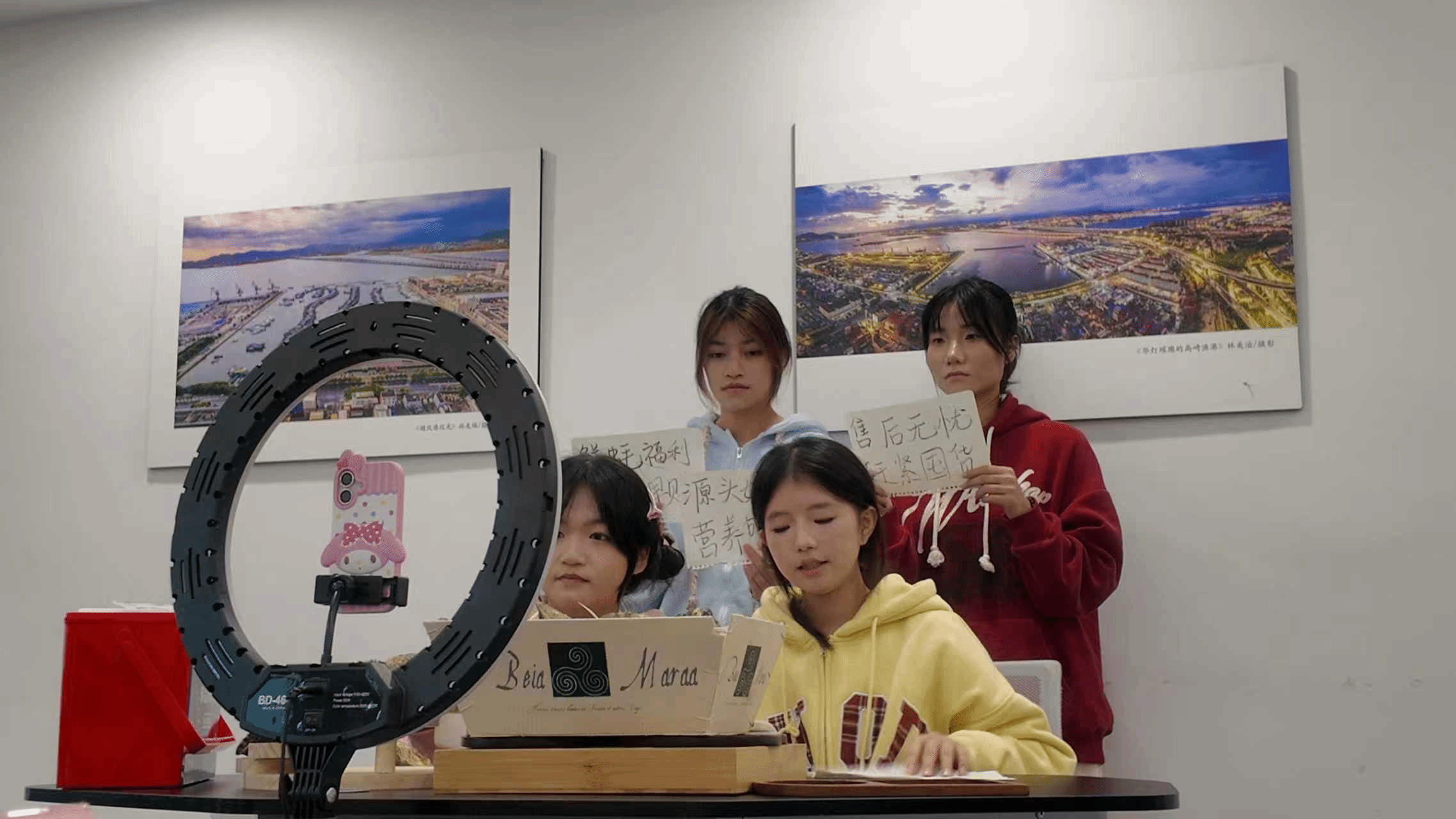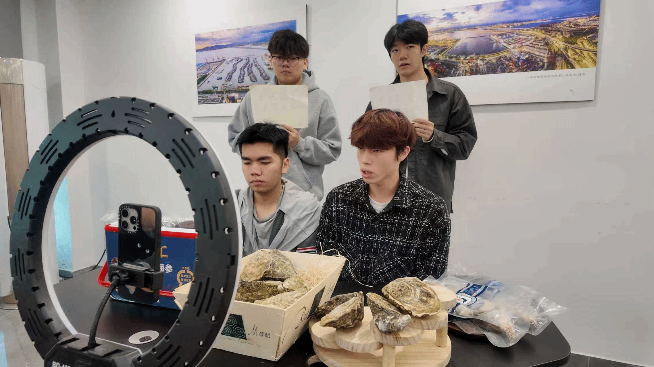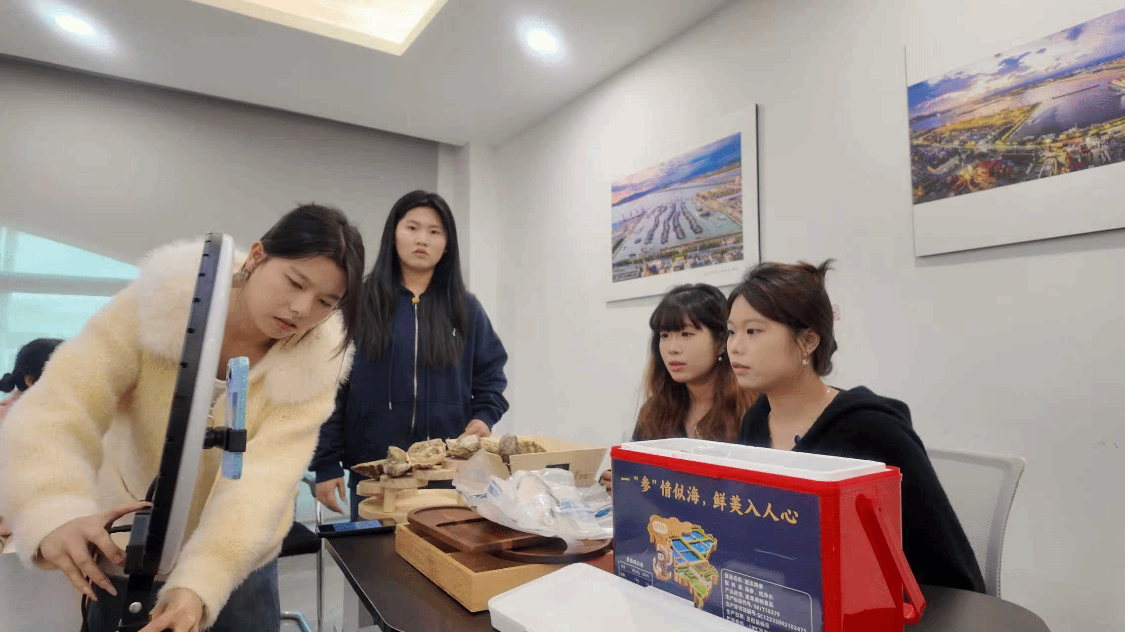 模拟直播环节中,28名学生以4人一组分为7组,分别围绕即食海参、午鱼、生蚝等夏商水产核心品类展开5-8分钟的现场模拟直播,学生根据前期调研打造差异化直播策略。各直播小组内部分工明确,充分展现团队协作能力,同时配备专业设备进行全程录屏,确保实操过程可追溯、可复盘。