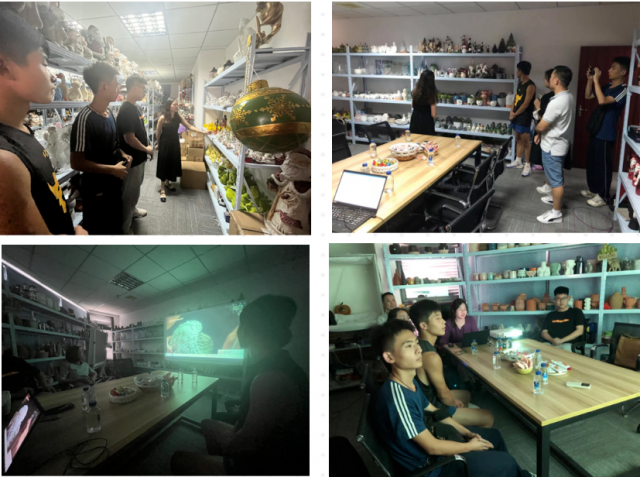 公司负责人陈总热情地为学生介绍产品生产工艺、分享营销故事和沟通技巧,亲切地为学生解答关于外贸行业的各种疑惑,让学生明白从事进出口贸易工作的道路很长,需要有一份耐心和毅力,持之以恒、脚踏实地坚持才是关键。已在该公司就业的两位学生详细地介绍了样品间里琳琅满目的陶瓷、树脂和布艺饰品,通过沟通交流,分享了她们外贸工作的心路历程。