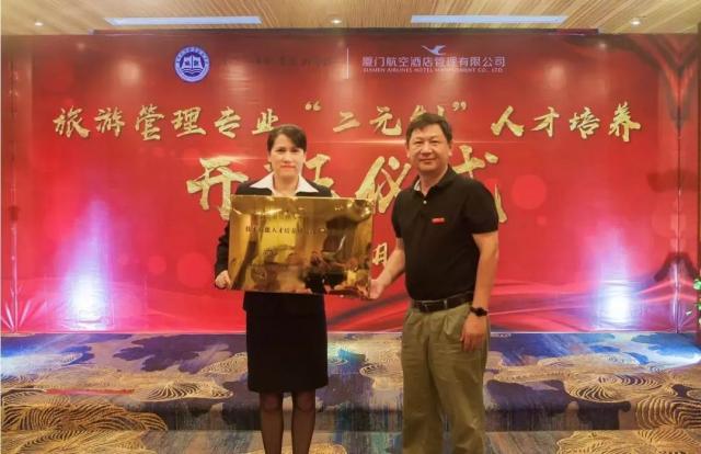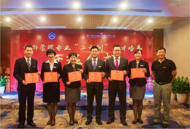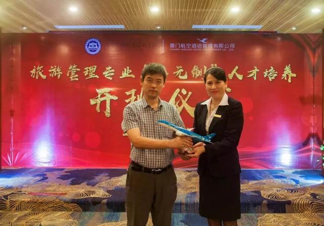 今天上午,我院与厦门航空酒店管理有限公司旅游管理专业“二元制”技术技能人才培养模式改革项目开班仪式在厦门金雁酒店举行。我院院长陈昌萍、副院长孙学耕,厦门航空酒店管理有限公司副总经理兼金雁酒店总经理潘桂红、质检培训部经理杨宏、人力资源部副经理林华出席开班仪式。