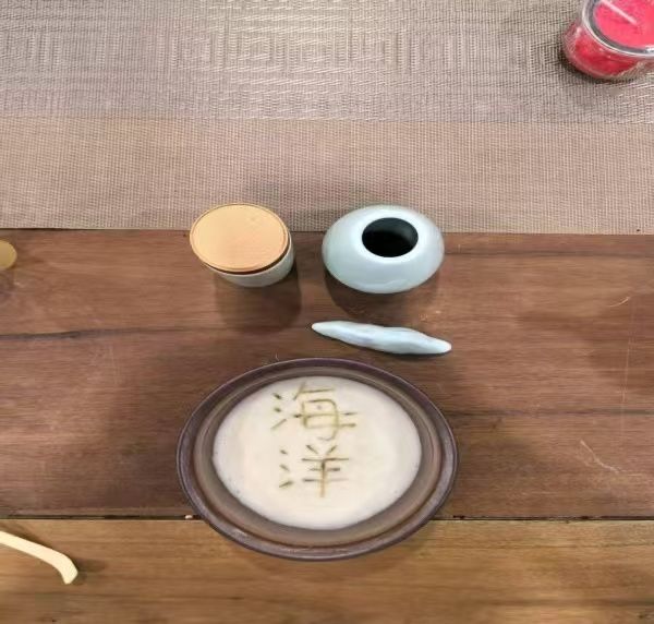 点茶悟文脉,一茶现千帆。时值中国共产党成立104周年之际,实践队着宋服、执建盏,在福建省春盏建窑文化博物馆完成一次“点茶+海洋”主题创作,把千年宋韵与新时代“向海图强”战略紧密勾连。大家以茶膏为墨,茶针为笔,在雪白汤花中绘就“蓝色国土”。一盏茶汤,映见宋人风骨;一幅海图,擘画复兴航程。点茶技艺在新时代被赋予“向海图强”的蓝色内核,成为青年学子以非遗语言讲好中国海洋故事的最佳注脚。