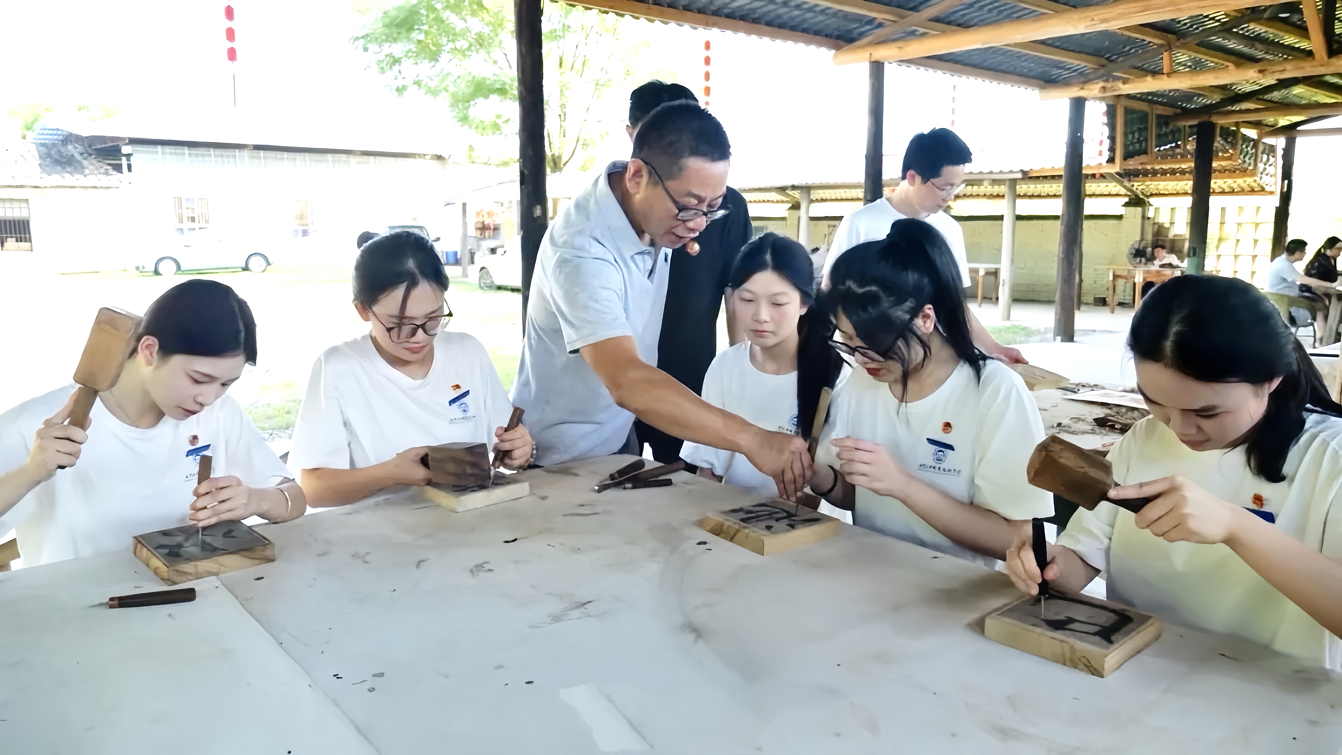 “麻沙枣木新雕文,传刻疏瘦不失真;纸如雪茧出玉盘,字如秋雁点秋云。”建阳雕版印刷技艺源远流长,古往今来在文人墨客心中有着不可撼动的特殊地位。其主要工序包括写样、校正、上样、刻板、印刷和装帧。在工艺师的悉心指导下,实践队员积极参与建本雕版的雕刻。