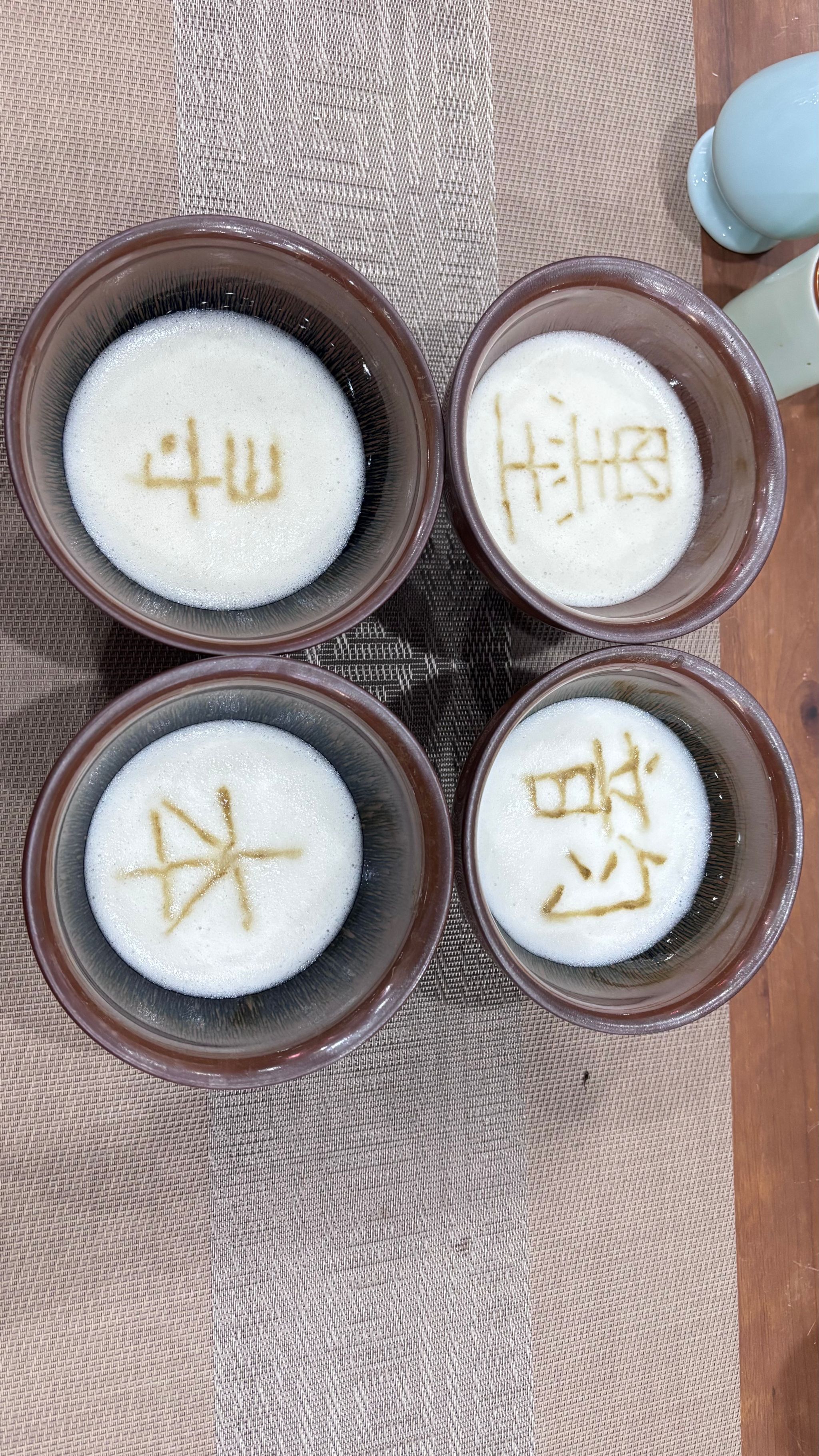 袅袅茶香在茶室内弥漫开,师生身着汉服尽显宋风雅韵,先后完成温盏、投茶、注水、击拂等步骤,并用茶针于茶汤面上绘画写字。大家拿起茶具击拂茶汤,沉浸式体验宋代点茶文化的滋味与神韵。一汤一世界,一沫一乾坤。通过点茶,师生们不仅品尝到茶的精华,还在茶汤沫浡中欣赏到如诗如画的图案,盏内茶香氤氲,恰是中华优秀传统文化跨越千年的呼吸。