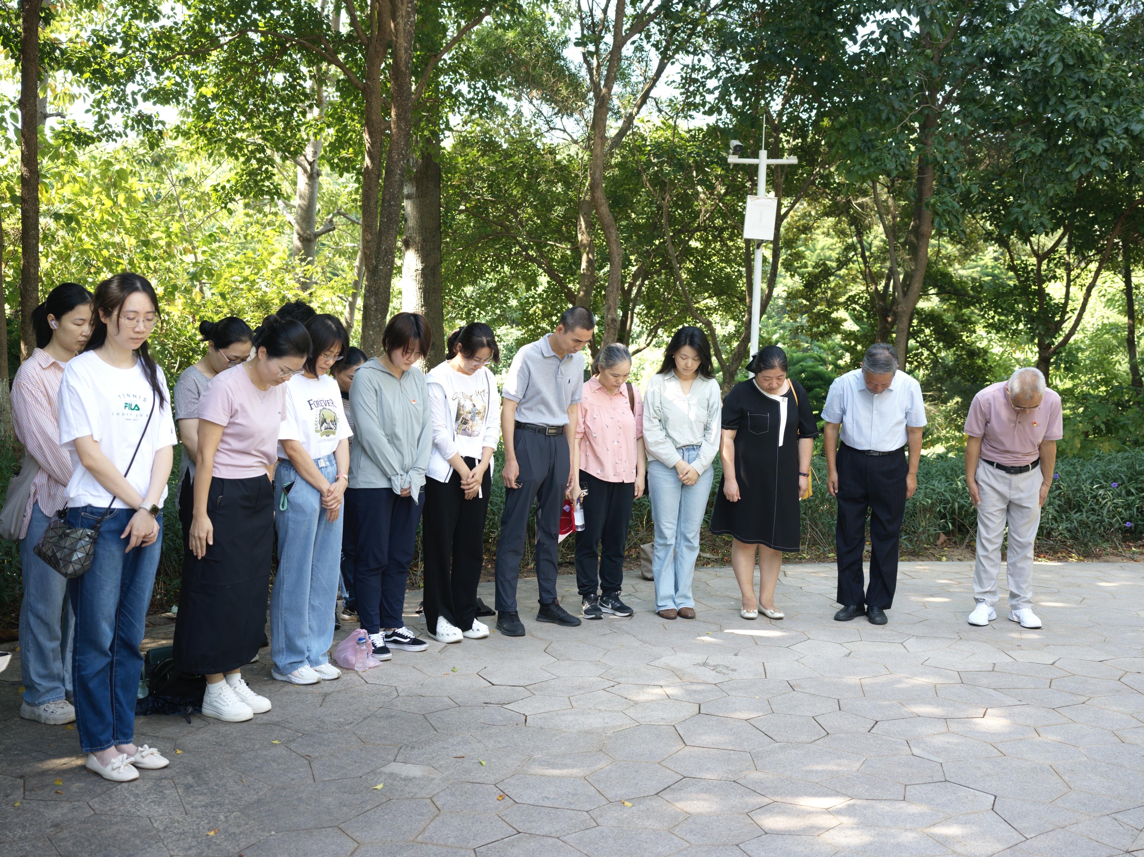 在庄严肃穆的“永铭在心”纪念碑前,潘世建先生动情回顾了1938年5月厦门军民浴血抵抗日寇侵略的悲壮历史。他指出,五通灯塔公园所处的土地,曾是日军登陆厦门的据点与埋葬无数英烈与同胞的“万人坑”,如今矗立的纪念碑,不仅是历史的见证,更是民族精神的火炬。王火灵带领全体党员肃立默哀,并强调:“作为党员教师,我们要将抗战精神融入教书育人全过程,培养学生‘向海图强’的使命担当。”