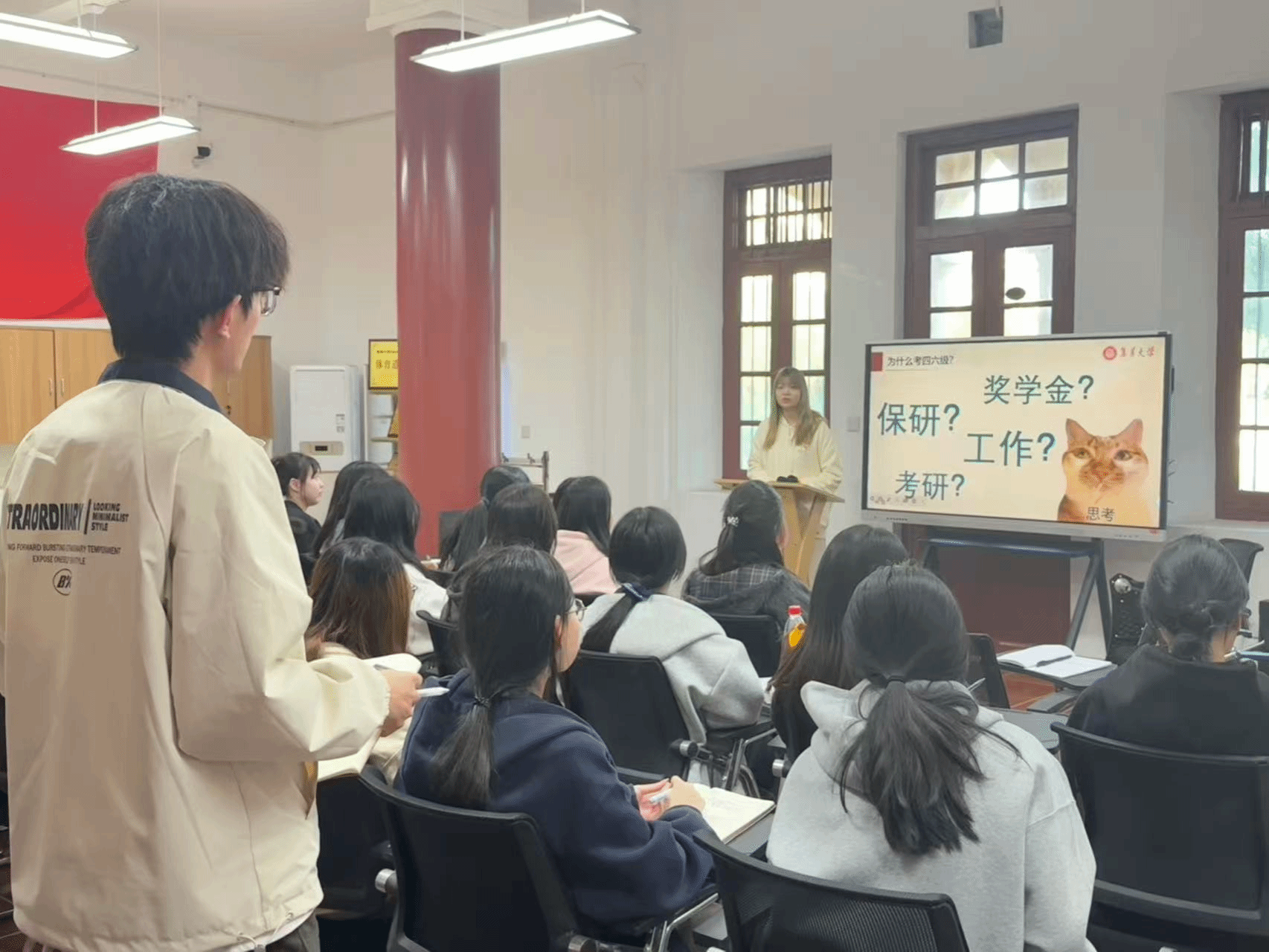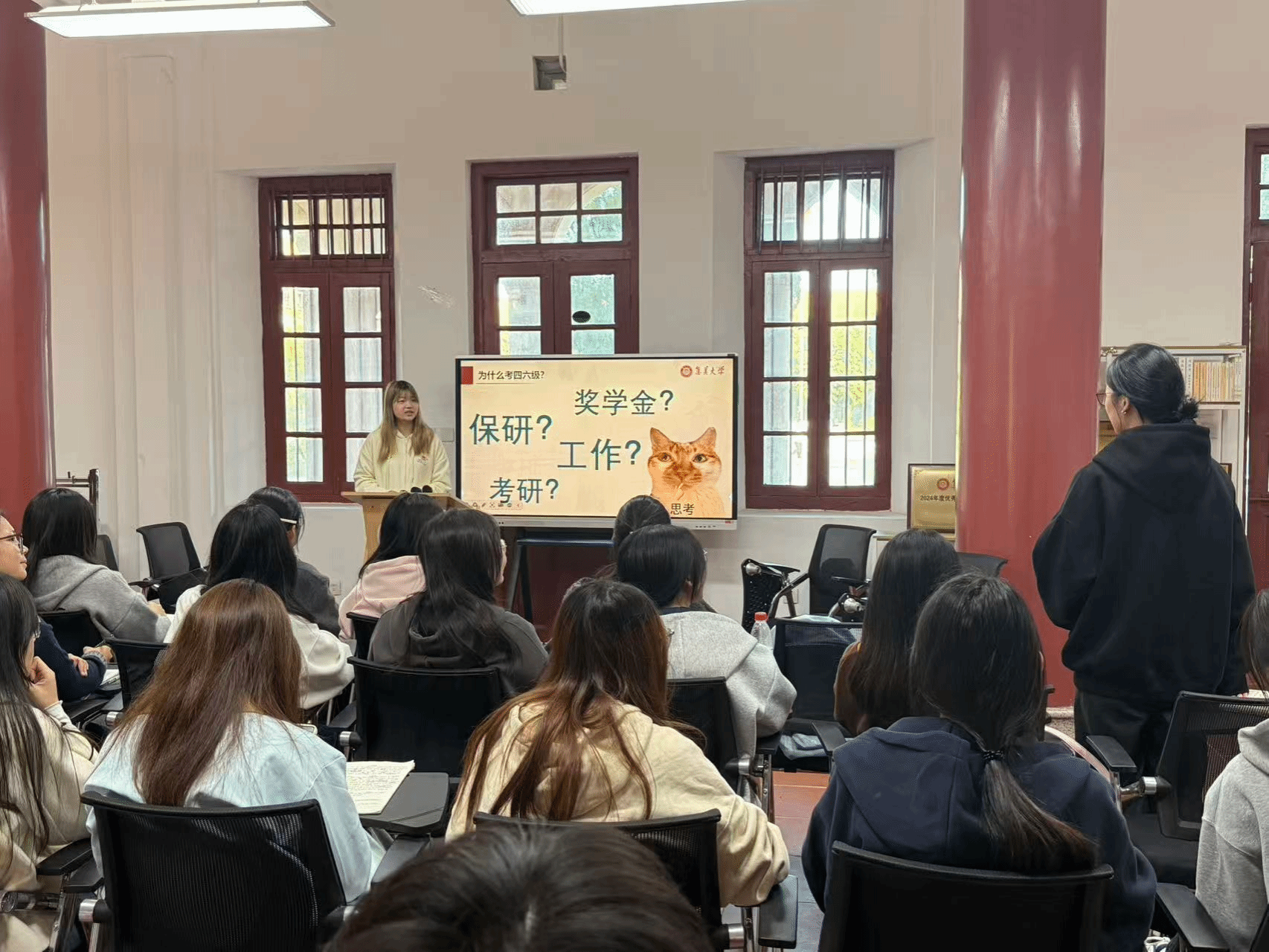 集美大学财经学院辅导员吴达鹏老师以“创新能力培养与职业发展”为题作专题分享。他围绕科创项目选题、实践路径和创新能力培养等内容展开讲解,既有理论深度,又有实践指导意义,为入党积极分子学业规划和职业发展指明方向。