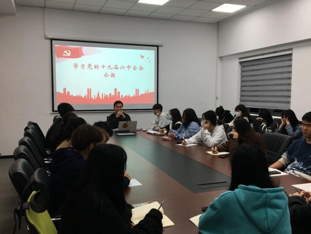 深入学习贯彻党的十九届六中全会精神和省第十一次党代会精神是当前和今后一个时期的重大政治任务。国际商贸学院学生党支部通过讲解PPT、通读公报等形式,组织学生骨干交流学习,引导全体学生从党的百年奋斗历程中汲取前进力量,争做社会主义现代化建设者和接班人。