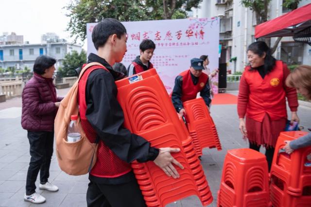 在莲岳社区广场上,青年团员协助思明区妇联、筼筜街道妇联、莲岳社区妇联等单位开展了文艺汇演。舞台上的老年文艺团们充满激情、载歌载舞、倾情演绎,彰显着“银发”担当;舞台下的青年志愿者们充满活力、干劲十足,或是悉心指引观众,或是不辞辛苦地搬运道具,又或是全神贯注地协助各项事务。不论是白发红颜、身影矫健的舞者,还是青春洋溢、朝气蓬勃的志愿者,他们因热爱而相聚,用艺术与爱心在这个特殊的节日里奉献热血、传递关爱。