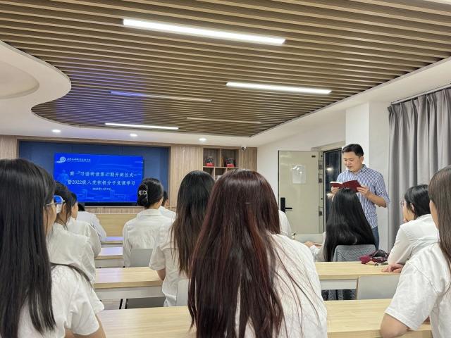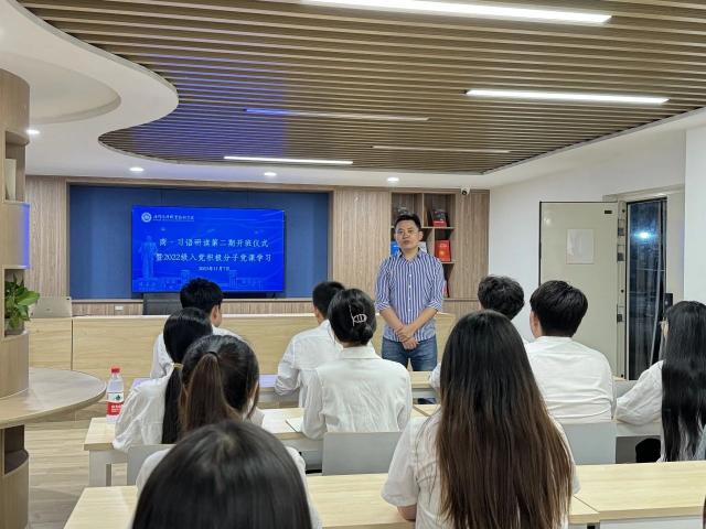 11月7日,国际商贸学院在一站式党群活动室举行“商习语研读”第二期开班仪式暨2022级入党积极分子党课学习,国际商贸学院组织员彭幸子作开班动员讲话和党课教育,2022级入党积极分子参加学习活动。