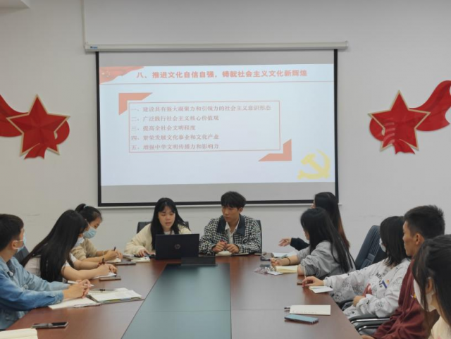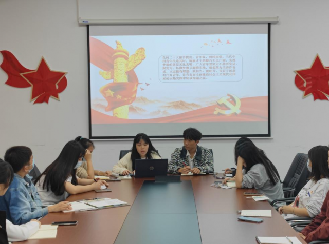 我院学生团总支负责人高艺萍在会议中与团学干部及各支部团支书一起学习党的二十大报告中的新观点、新论断、新思想,呼吁大家要紧跟党的步伐、紧跟时代潮流,坚定信心、顽强拼搏,在新时代新征程上发挥先锋模范作用,贡献青春力量。