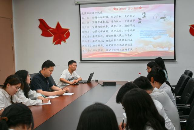 为深入开展党纪学习教育,进一步加强毕业生党员的党性修养和社会责任感,6月16日下午,国际商贸学院党总支组织2024届毕业生开展党纪学习教育。学院党总支书记王火灵、党总支副书记黄昆仑、组织员彭幸子、辅导员陈炜丹、彭志勇、张琼以及2024届毕业生党员参加。
