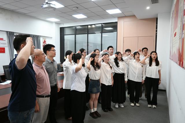 随后,举行重温入党誓词的仪式,彭幸子领誓,王火灵、黄昆仑监誓,全体毕业生党员高举右拳,面向党旗,重温入党誓词,进一步强化党员身份意识,提升党员的责任和使命感。