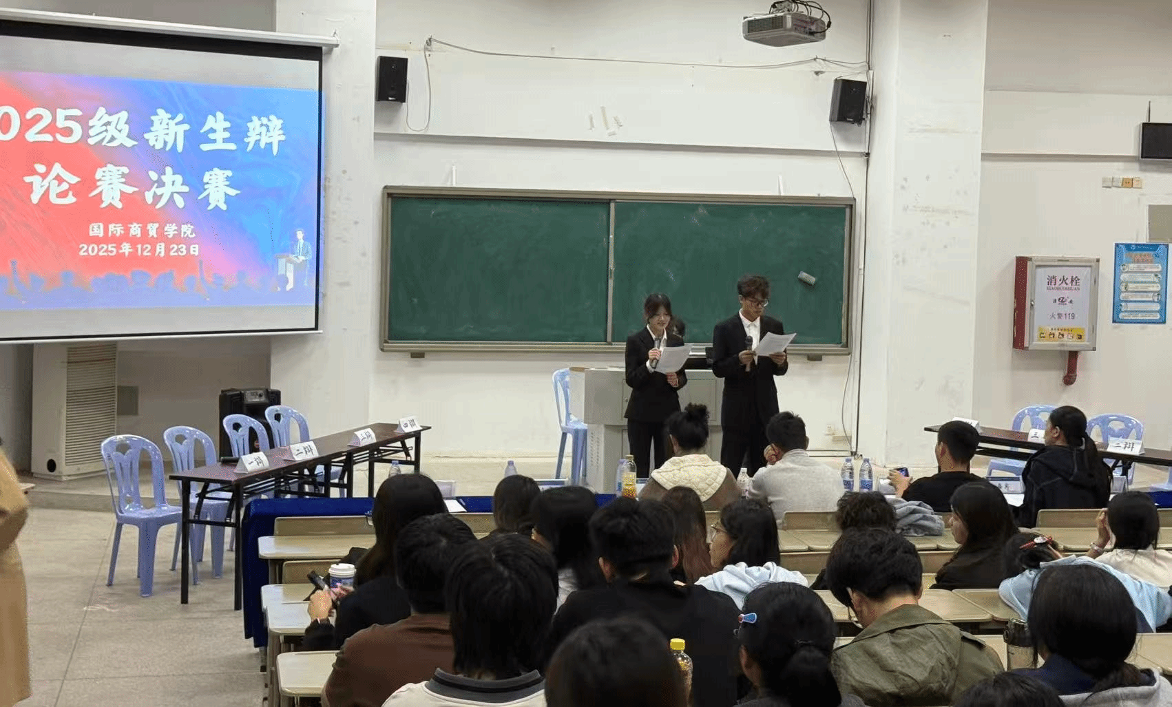 辩是非曲直,论古今方圆。 12月23日下午,国际商贸学院2025级学生辩论赛决赛在翔安校区举行。比赛邀请海洋生物学院邹璇,海洋机电学院傅传杰、许黄琛,国际商贸学院彭志勇、王海五位老师担任评委。