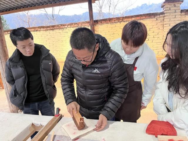 建阳建本雕版印刷,作为福建省省级非物质文化遗产,承载着千年的文化积淀。师生们走进古老的印刷作坊和建本文化展览馆、体验馆等,目睹了从刻板到印刷再到装帧的每一道工序。“记住,刻刀是我们的画笔,握笔的姿势可不能错。”“雕刻时,力度要均匀,心要静。”“不要着急,慢慢来,感受木料的质地,顺着它的纹理走。”“记住,大胆下刀,小心修正”,建本雕刻印刷非遗传承人夏仔勇老师一边示范一边讲解,在师傅的指导下,学生们亲手体验了雕版印刷的全过程,感受了传统技艺的精湛与匠心独运。