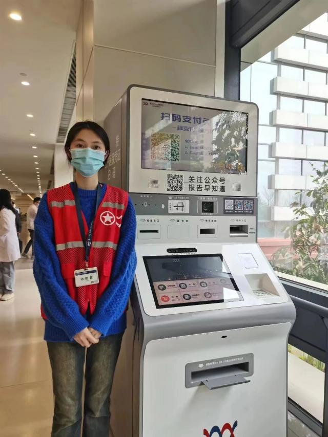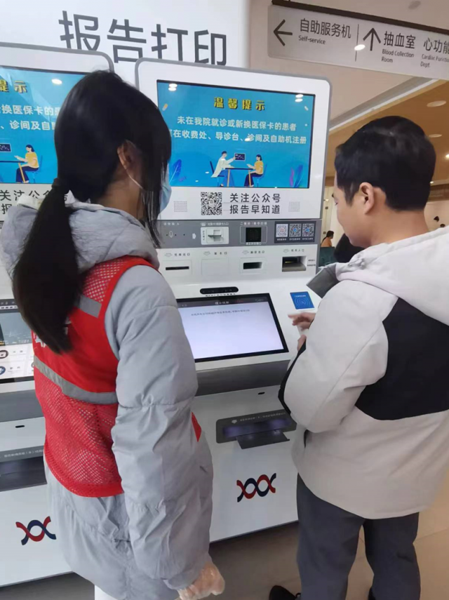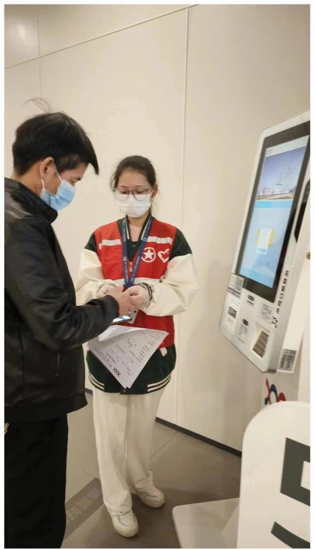 接受岗前培训后,学生们穿上红马甲,以饱满的热情走上志愿服务岗位,帮助患者或家属使用自助机或手机端进行挂号、缴费、取化验报告单等,引导患者就诊,维持文明就诊秩序,为行动不便、无陪护老年患者提供陪诊等温馨服务。