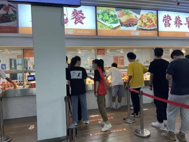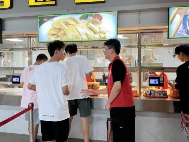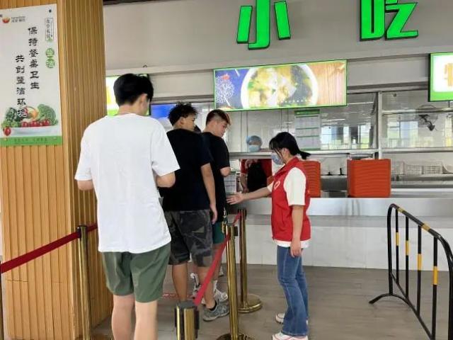 在我校师生错峰就餐的时间段,志愿者们分别在三个食堂维护着食堂的排队秩序,提醒同学们间隔一米、保持安全距离。在志愿者们的有序引导下,不仅进一步增强了学生们用餐期间的疫情防控意识,也通过别样“红”的表率作用展现海院学子无私奉献的青春风采。