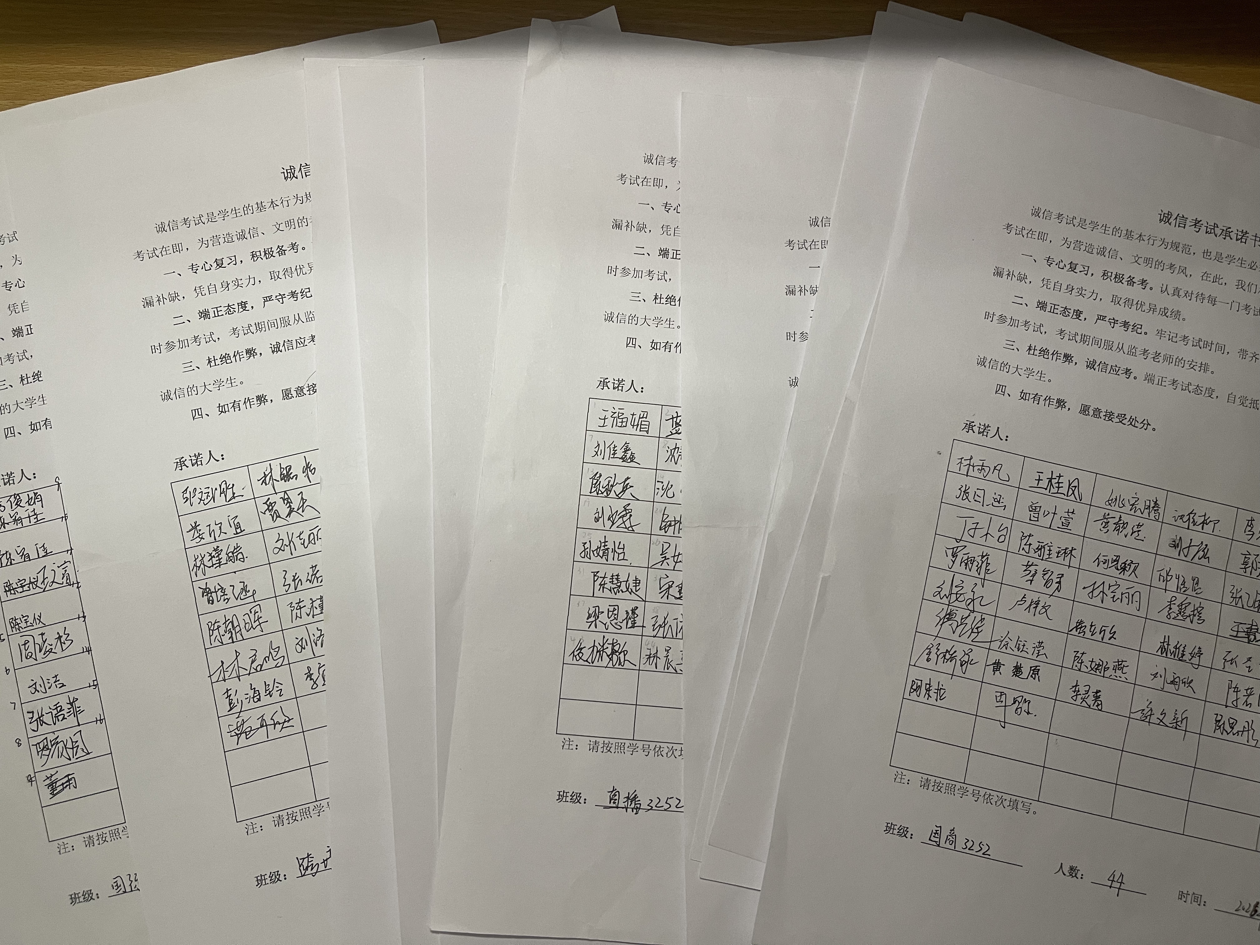 全体同学郑重签署《诚信考试承诺书》,承诺自觉遵守考试纪律,拒绝作弊行为,以真实的学习水平接受检验。一笔一划的签名,体现了同学们对学业考试的尊重、对自我成长的负责,也彰显了坚守诚信的决心。