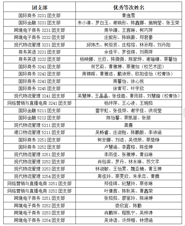 优秀等次团员97人(具体名单见附件,按团支部排序,排名不分先后);合格等次团员289人,基本合格等次团员0人,不合格等次团员0人。其中,合格、基本合格等次团员名单由各团支部内部公示确认,学院层面不再重复公示。