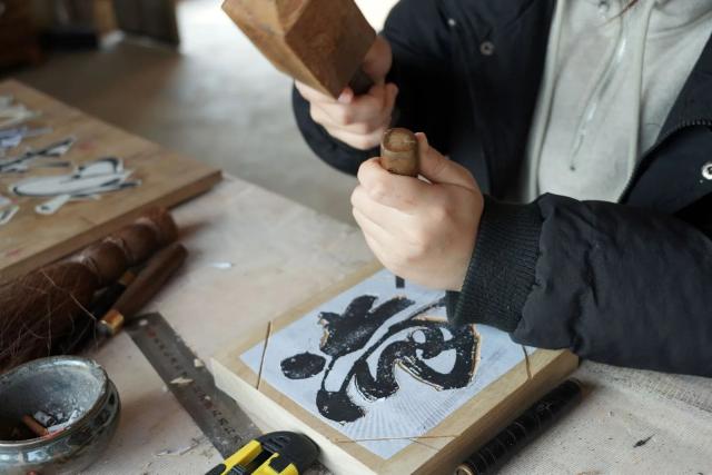 建阳建本雕版印刷,作为福建省省级非物质文化遗产,承载着千年的文化积淀。师生们走进古老的印刷作坊和建本文化展览馆、体验馆等,目睹了从刻板到印刷再到装帧的每一道工序。“记住,刻刀是我们的画笔,握笔的姿势可不能错。”“雕刻时,力度要均匀,心要静。”“不要着急,慢慢来,感受木料的质地,顺着它的纹理走。”“记住,大胆下刀,小心修正”,建本雕刻印刷非遗传承人夏仔勇老师一边示范一边讲解,在师傅的指导下,学生们亲手体验了雕版印刷的全过程,感受了传统技艺的精湛与匠心独运。