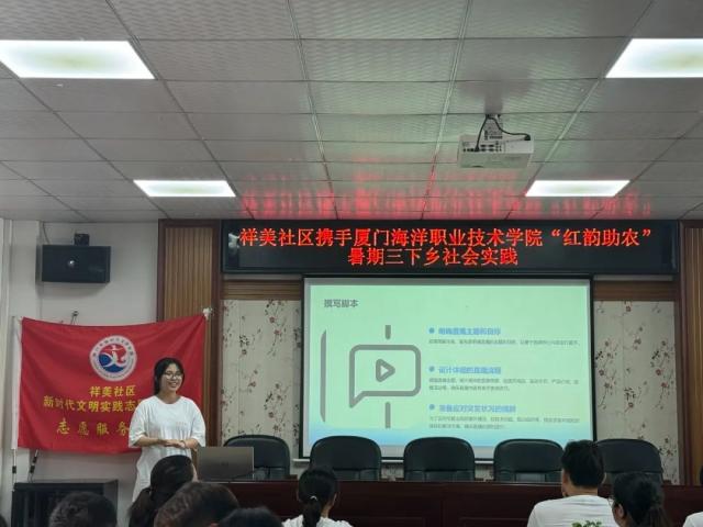 为深入学习领会习近平总书记关于青年工作的重要思想,积极引导青年学生深入基层挺膺担当,响应大兴调查研究之风,将青年梦扎根在实践的田野上,厦门海洋职业技术学院“红韵助农”暑期三下乡社会实践队前往厦门市翔安区新店镇祥美社区开展实践活动,实践队结合专业知识,发挥专业技能,利用新媒体平台,通过科技下乡的形式,以科普惠农、科技助农为乡村振兴注入青春力量,激活新动力,共绘乡村振兴美丽新画卷。