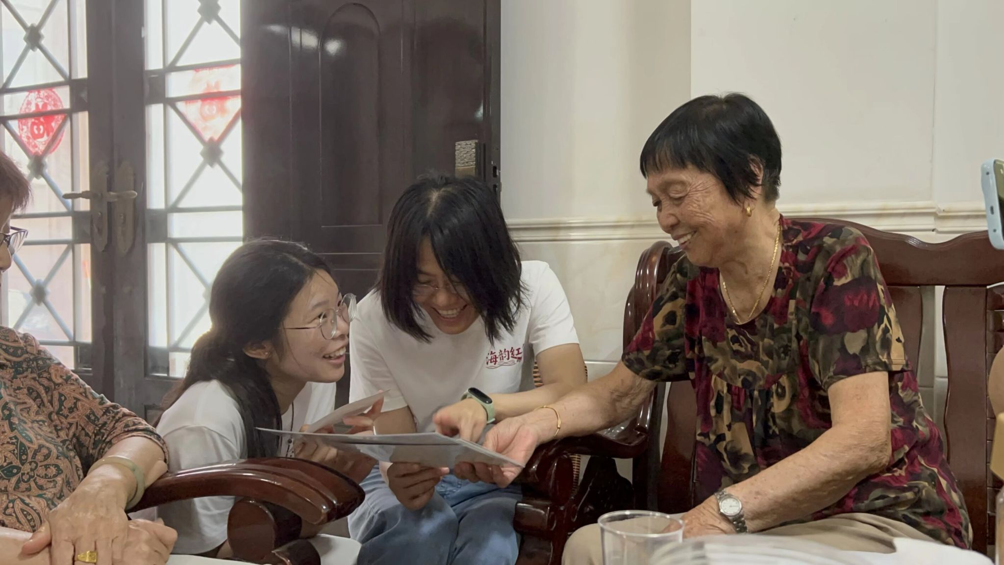 实践队成员怀着崇敬之心,拜访了曾亲历金门炮战的两位英雄——许含笑和许秀乖奶奶。围坐在木椅上,队员们仿佛穿越时空,回到了那个硝烟弥漫的年代。