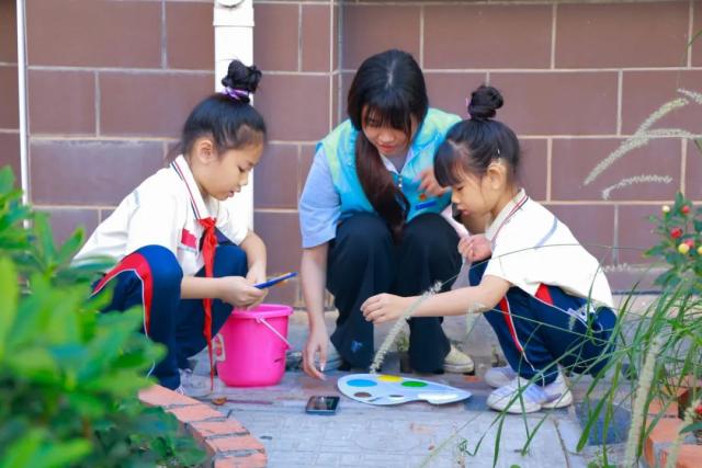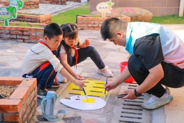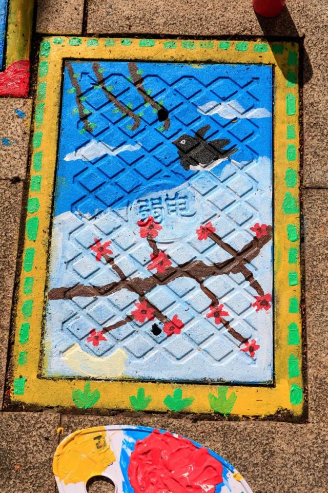 志愿者们拿起画笔,先为小学生们打样,教他们如何绘画与涂色,小朋友们认真听、认真画,他们互相配合,在井盖上绘出一幅幅色彩斑斓的画。