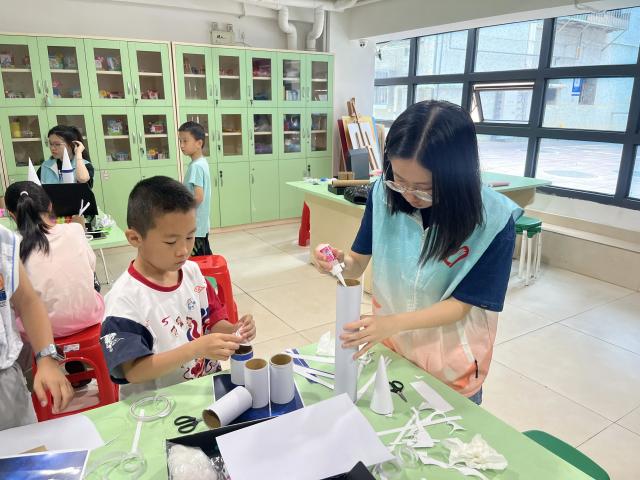 在手工环节,社区活动室秒变“太空制造局”!青协志愿者与社区工作人员分组指导,手把手教孩子们用塑料瓶、彩卡纸、颜料等材料,制作专属火箭模型。从裁剪尾翼的小心翼翼,到组装火箭的专注认真,再到涂鸦上色的天马行空,每一个环节无一不体现着小朋友们对制作过程的全身心投入。经过一番热火朝天的“太空制造”,一个个造型各异、充满个性的DIY火箭模型终于“大功告成”!它们在孩子们手中“整装待发”,仿佛随时准备发射,开启一场奇妙的太空之旅。
