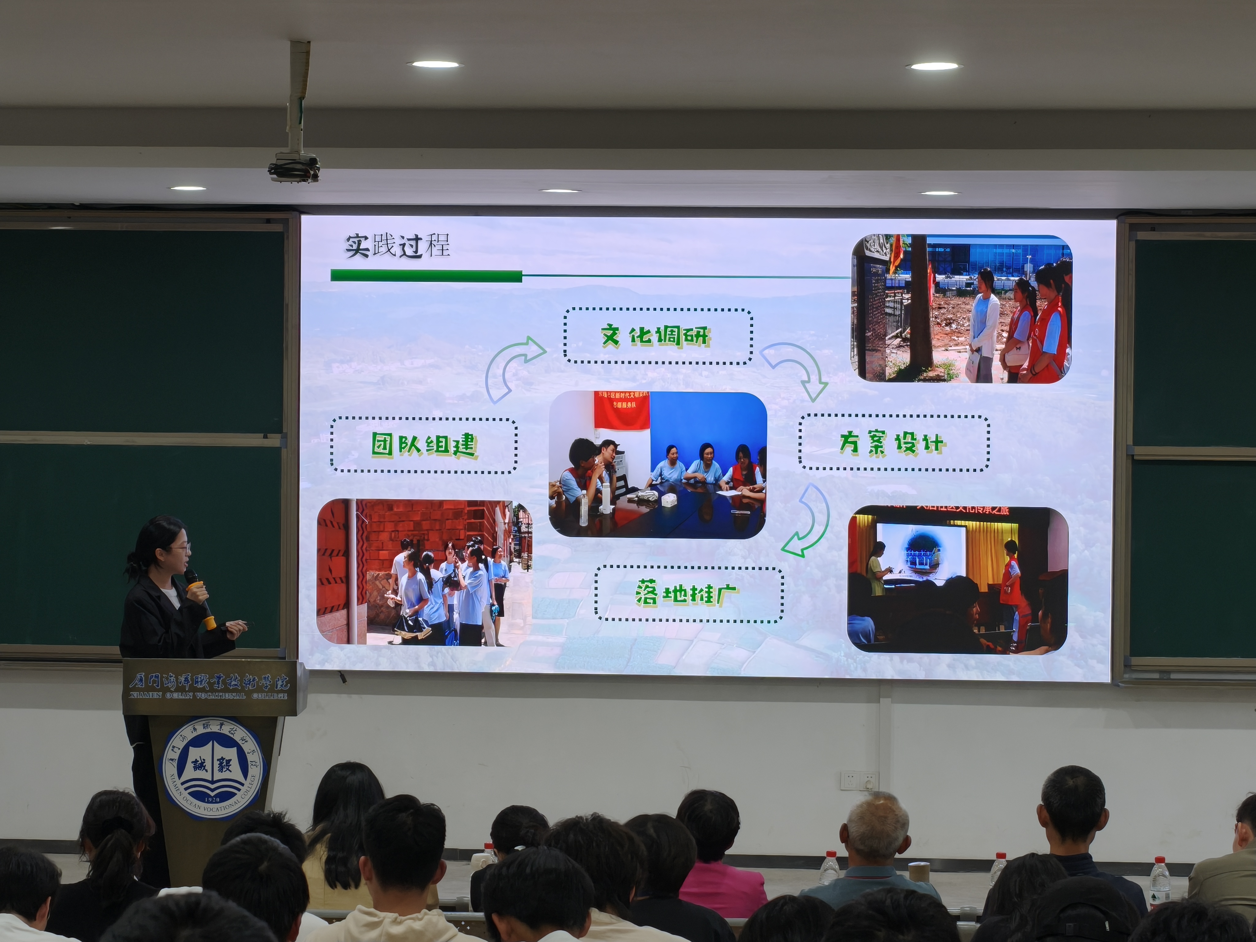 10支实践团队依次上台进行汇报,评委老师从“三下乡”服务成果、PPT内容、现场汇报表现、视频制作等方面对各团队进行打分。
