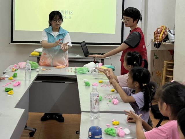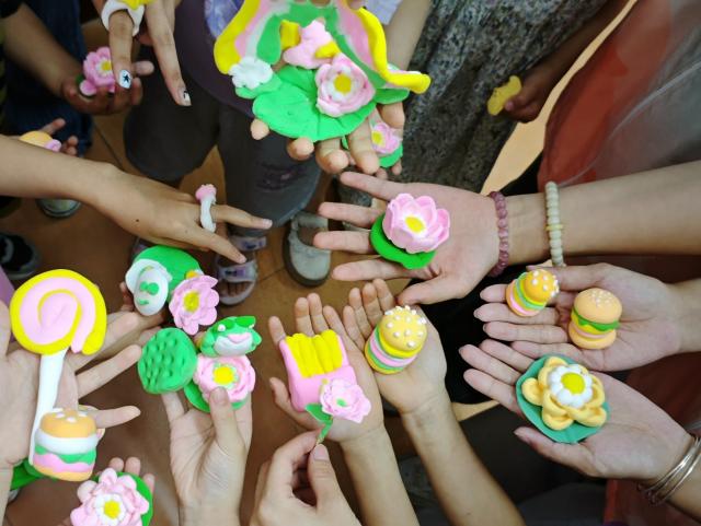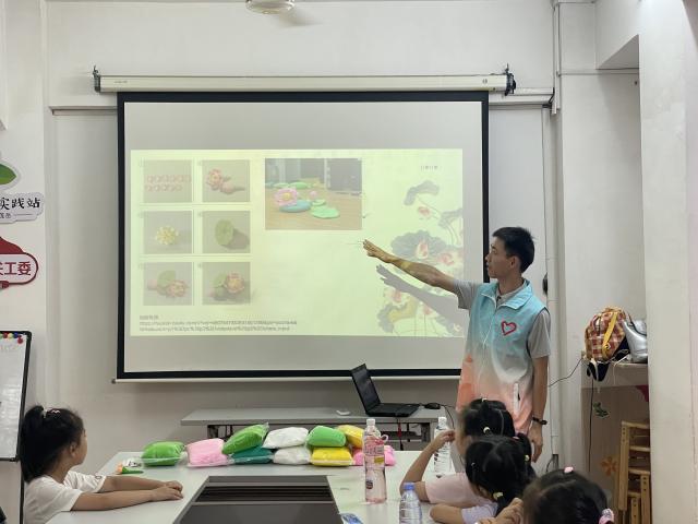 活动伊始,志愿者担任小小老师,详细地向小朋友们讲解了制作黏土莲花的方法、技巧以及色彩搭配,给小朋友们分发黏土、纸盘、牙签等,让大家用手拉一拉、搓一搓,感知黏土材料的特性,并指导他们掌握揉圆、搓条、按压的技巧。