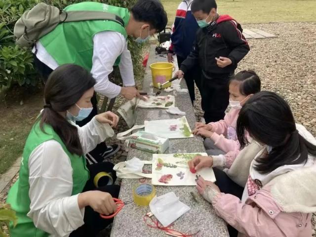 第三部分,进行植物拓染。志愿者们引导孩子们发挥自己的创意和想象空间,在布袋上印下属于自己独一无二的美丽作品。孩子们都露出了喜悦的笑容,感受到了来自志愿者们的关心和温暖,不约而同地主动邀请志愿者们一同在小木牌上写下自己的名字,记录下这段快乐记忆、营造温馨氛围。