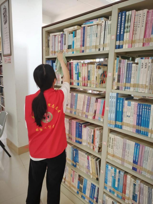 4月27日下午,志愿者们在图书馆集合,对图书馆清扫区域进行分工,开展书籍除尘、书桌清洁等工作。志愿者们站在摆满书籍的书架面前,从冰凉的书架到一本本闪烁着人类智慧的书籍,志愿者们认真地擦拭堆积其上的灰尘。他们时而蹲下时而站起,齐心协力,默契配合,撸起了袖子加油干,以确保每一本书都摆放得整齐有序、书架干净如初,阅读区焕然一新。考虑到图书馆是公共学习的地方,志愿者们做到了无声清扫,为图书馆留下的是“净”更有“静”。为营造整洁优美、规范有序、和谐文明、充满生机的校园打下坚实基础。