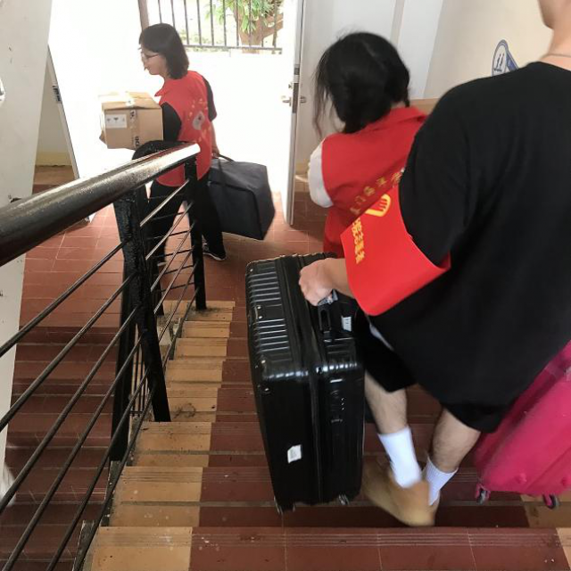 活动当天,志愿者们统一穿上红马甲,备好小推车,开启了搬运行李之旅。他们数次往返宿舍、北门和西门,并按照离校生的需求将行李搬运到指定地点。