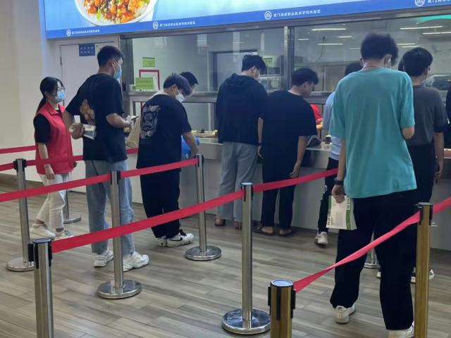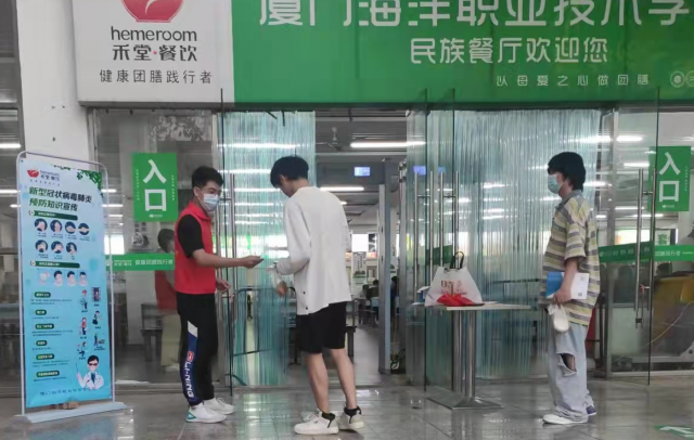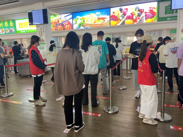 为避免用餐拥堵,做好用餐时间段食堂疏导工作,3月14日开始,志愿者们在食堂进行早、中、晚餐的维序工作:提醒师生排队保持一米间距,提醒同学们佩戴好口罩,并为没有随身携带口罩的同学提供口罩。