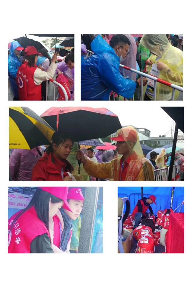 从七点赛场布置完毕,清场,巡视赛道,运动员陆续进场,志愿者帮选手们保管他们的私人物品。到了八点比赛也正式开始了,志愿者们开始为运动员指引赛道,在衣物寄存的地方,志愿者们则有序的整理物品,只为能让选手在比赛结束后更快的拿到自己的物品。我们虽然辛苦,但一切都因选手们的感谢而值得!
