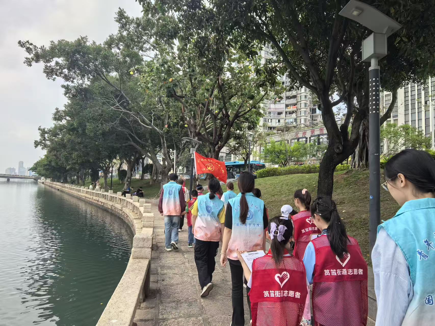 社区领导为生态文明护卫队授旗,标志着这支由“老少青”三代组成的志愿队伍正式成立,开启了我院青年学生参与共建莲岳社区生态美的新征程。鲜艳的队旗交到松柏小学少先队员和志愿者代表手中,承载着大家守护筼筜湖的共同心愿与责任担当。