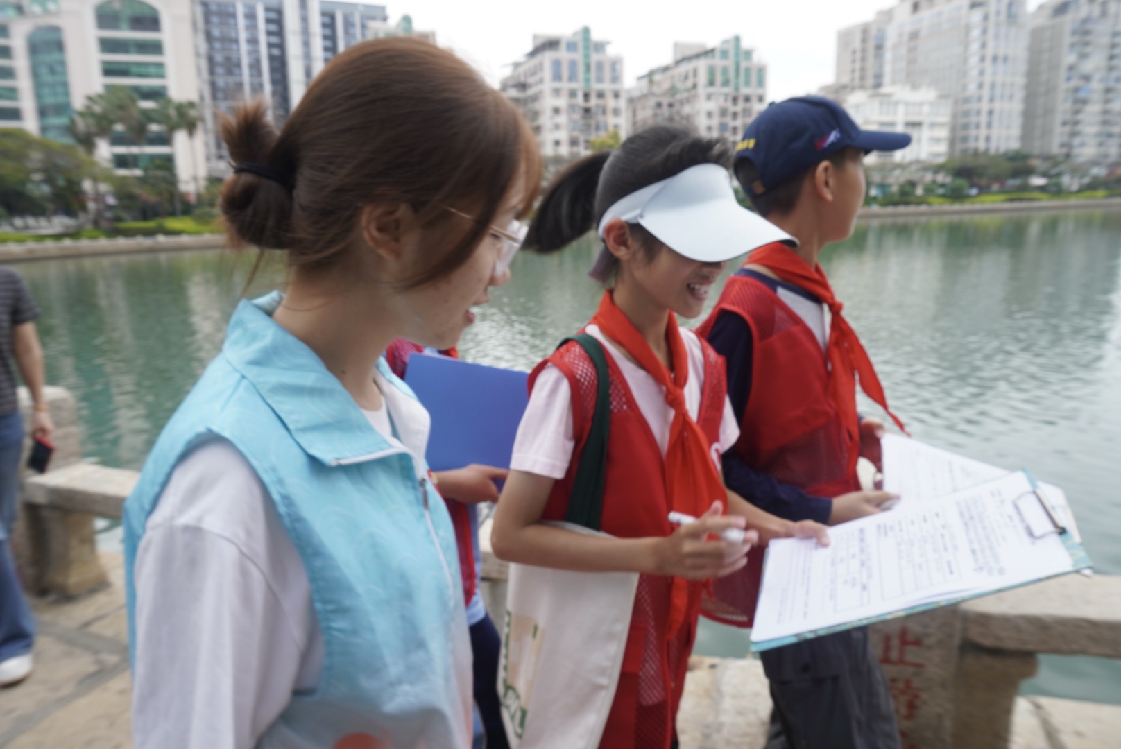 授旗结束后,生态文明护卫队前往筼筜湖环湖步道开展护卫行动。现场暖意融融,“五老”志愿者耐心指导观察方法,小朋友们手持记录册,认真记录湖水清澈度、植被生长情况,专注搜寻白鹭身影、计数其出现次数与频率;我院青年志愿者全程陪伴,引导规范记录、讲解生态知识。三代人携手,构成春日最美风景线。