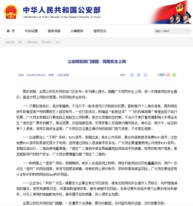 国庆假期,全国公安机关网安部门发布一系列暖心提示,提醒广大网民安全上网,进一步提高网络安全意识,营造文明上网良好氛围,共筑网络安全防线。