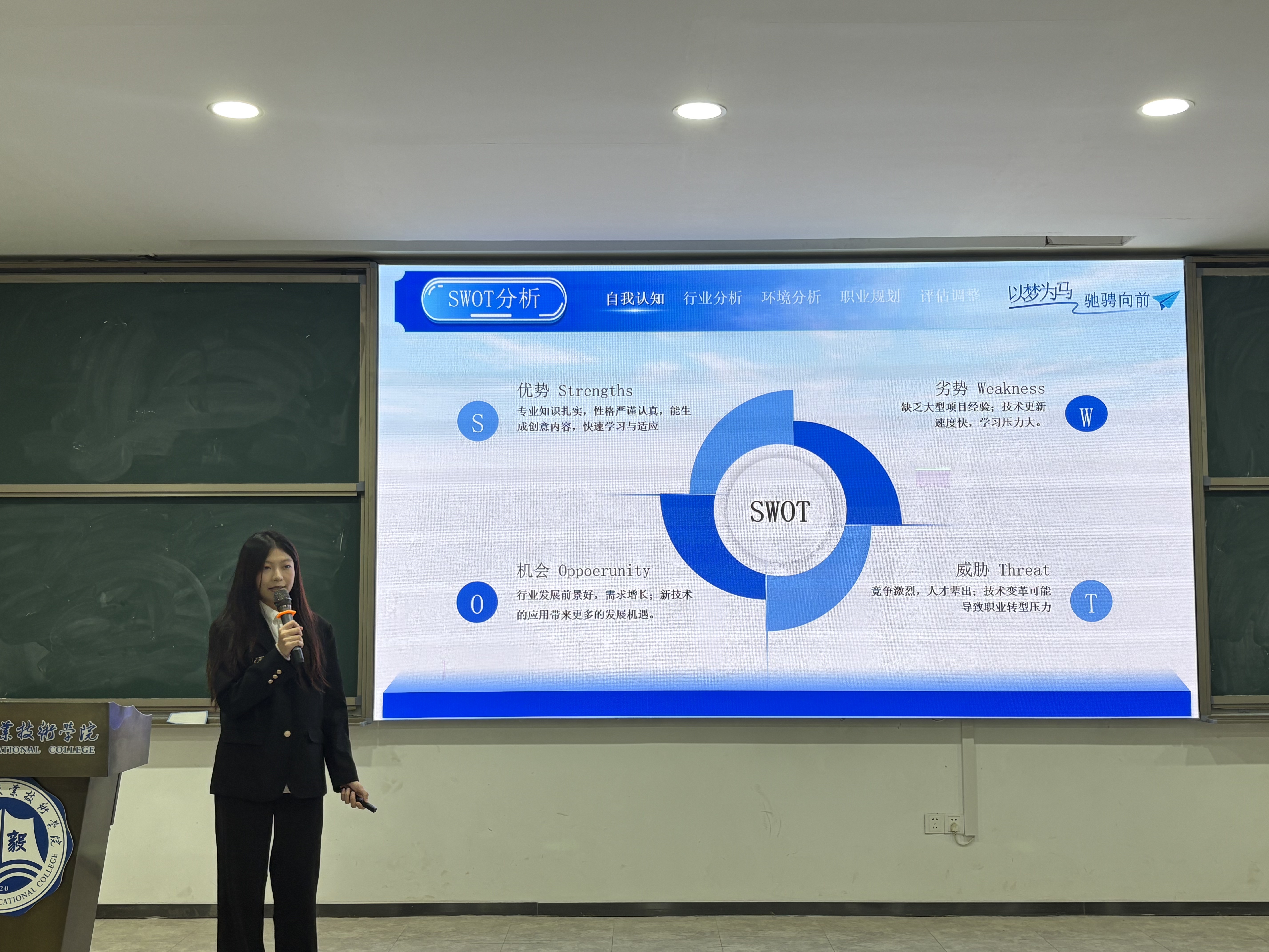 参赛选手根据个人综合素质和自身实际情况,进行合理的职业生涯规划,并提交结合个人实际情况与社会需求的个人职业生涯规划书。决赛选手依次上台路演,充分展现新时代青年大学生朝气蓬勃的风貌与职场新人的职业形象。