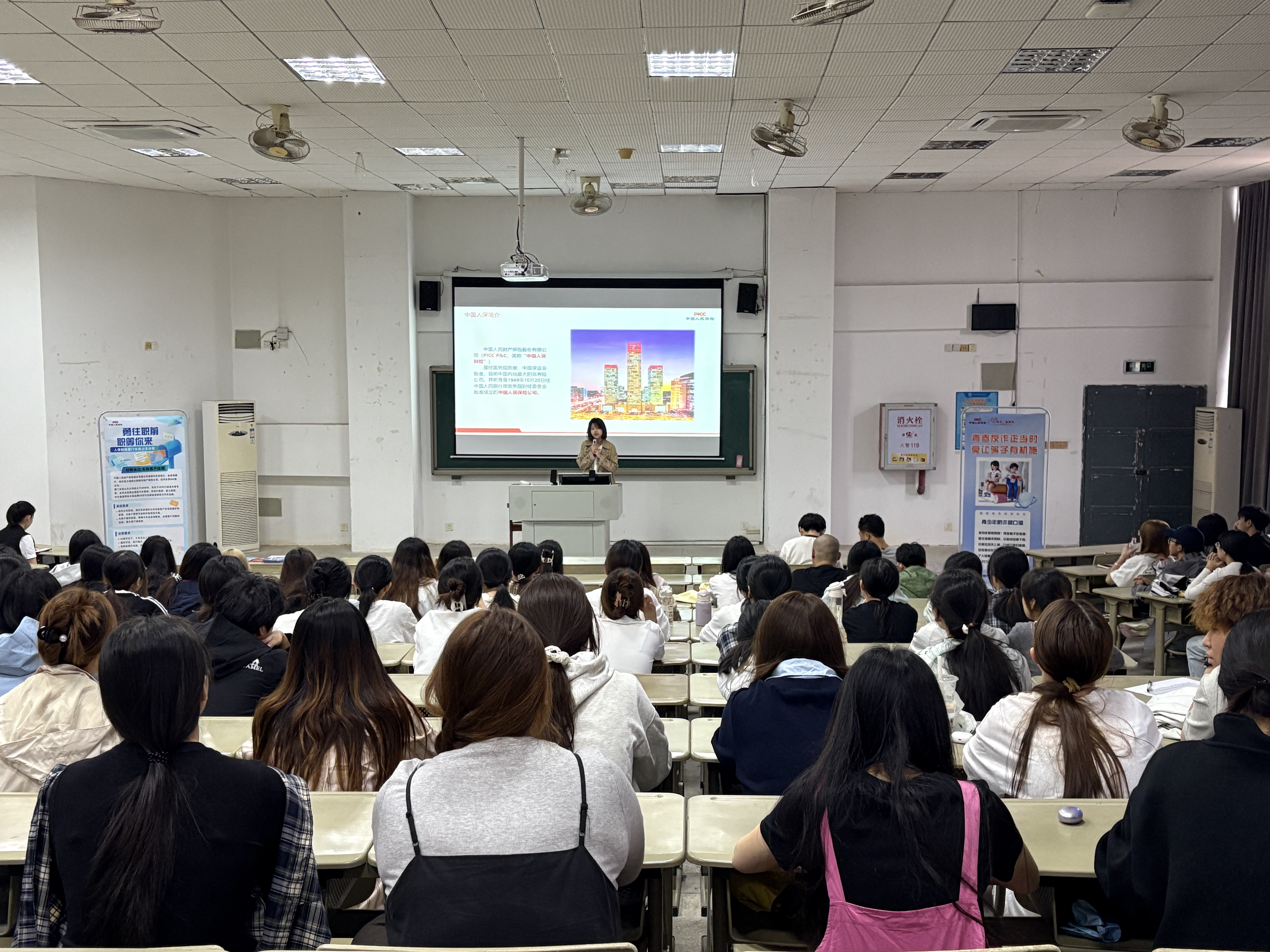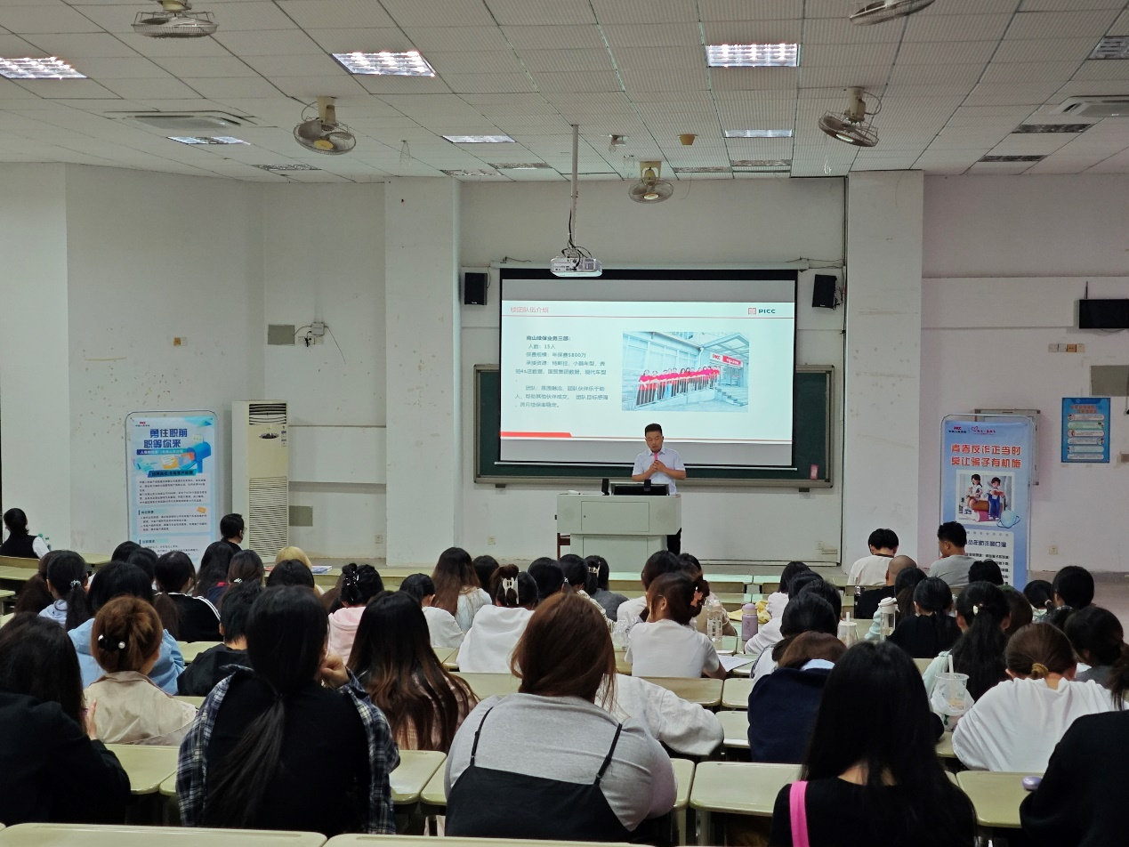 首先,公司综合部阮老师开场,介绍了企业基本情况和“以文化人 聚力凝魂”的企业文化内核与员工福利,让同学们直观感受到央企平台的稳定性与人性化关怀。随后,续保业务部门经理解析团队架构与业务布局,明确薪酬考核机制与职业晋升路径,为同学们勾勒出清晰的职场成长蓝图。