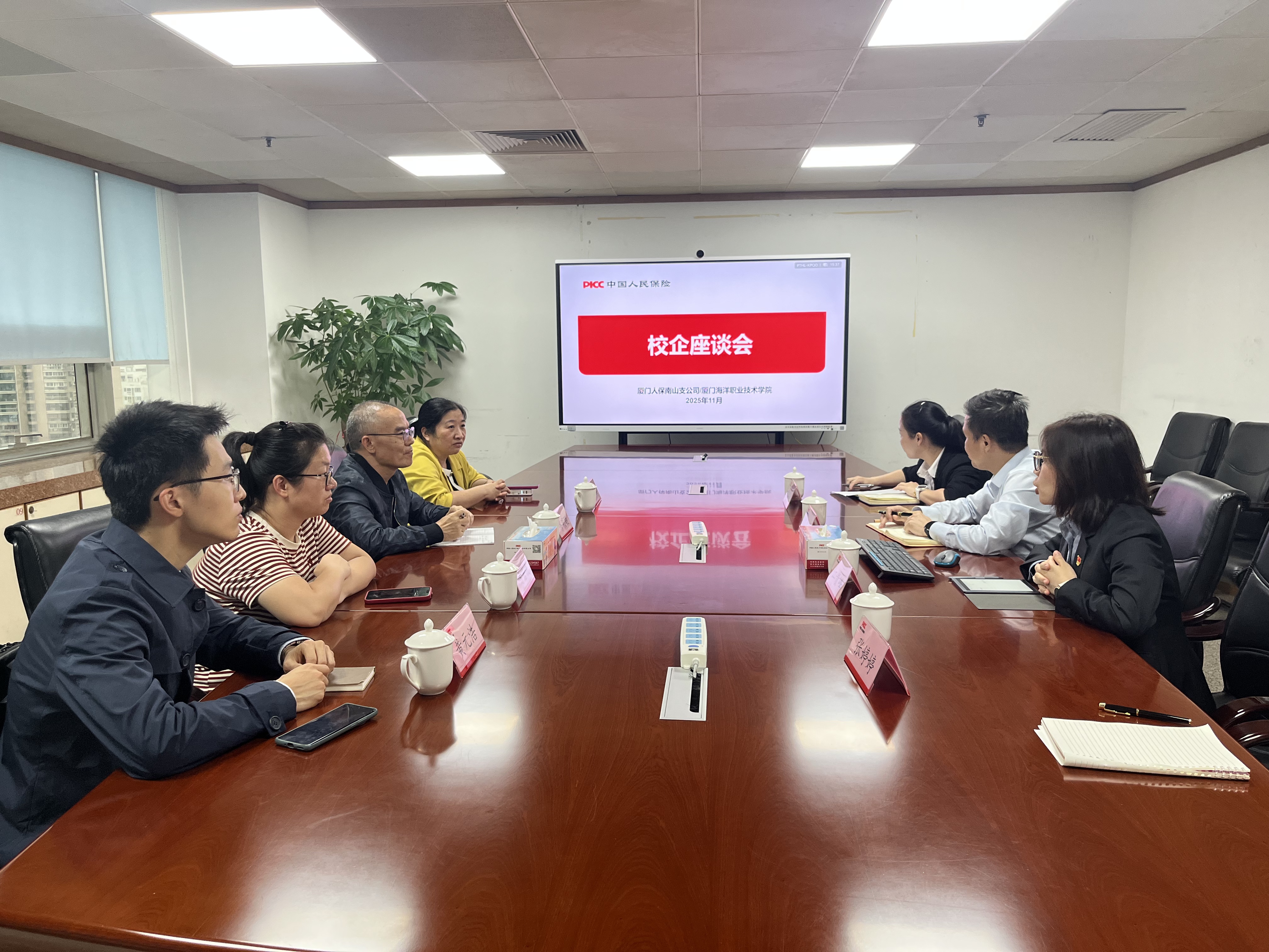 座谈会上,学院教师与中国人保厦门南山支公司总经理陈伟杰、副总经理江贵峰,以及陈娉婷、张婷婷进行了深入交流。校友陈娉婷介绍了中国人保厦门南山支公司总体情况,包括工作场景、工作内容、员工福利等。校企双方围绕今年招聘的岗位需求、实习工作内容、毕业生职业发展路径以及后续合作方向进行了深入的探讨,表示将继续加强合作,共同推动人才培养和毕业生就业工作。