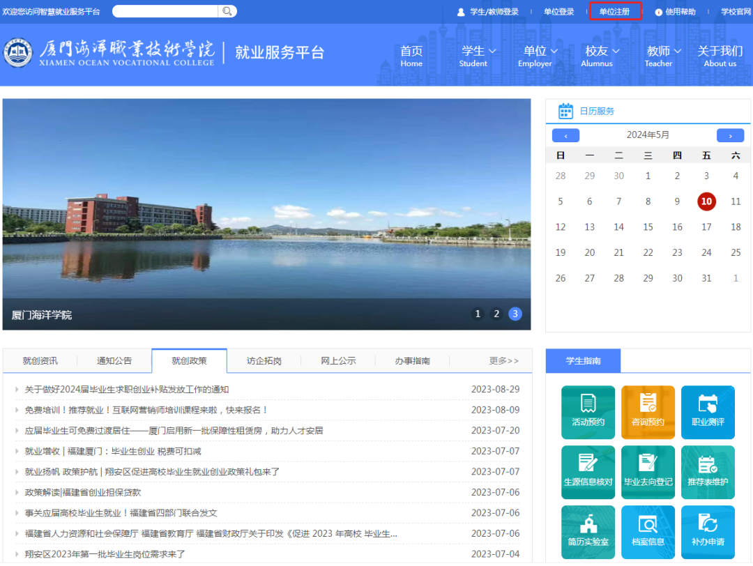 第一次报名需先在我校“智慧就业服务平台”进行注册,在首页右上角点击“单位注册”按钮,跳转注册页面;再根据注册页面引导进行注册。单位注册完成后需等待学校审核,学校审核通过后将通过邮件通知提醒。审核通过后用人单位即可登录,并进行招聘会报名。