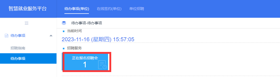 用人单位登录成功后,在系统中点击“待办事项”,在待办事项中,点击“正在报名的招聘会”进行招聘会报名。报名时间(2025年10月15日至2025年10月28日)