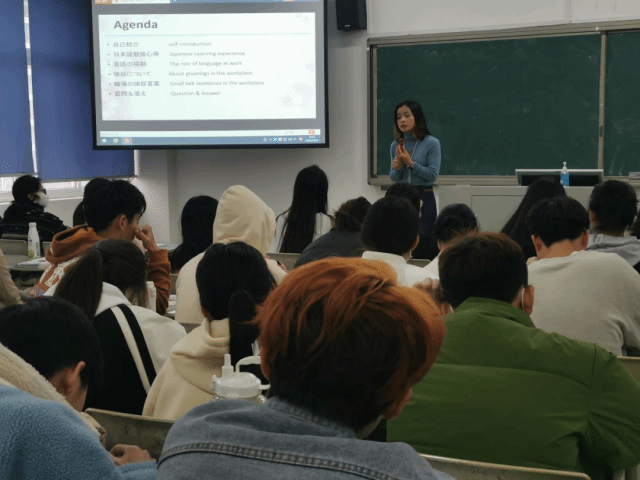 3月29日下午,佛吉亚歌乐电子(厦门)有限公司研发中心测试高级经理连容女士受邀走进课堂,为21级商务英语专业的同学们上了一次精彩的基础日语课。