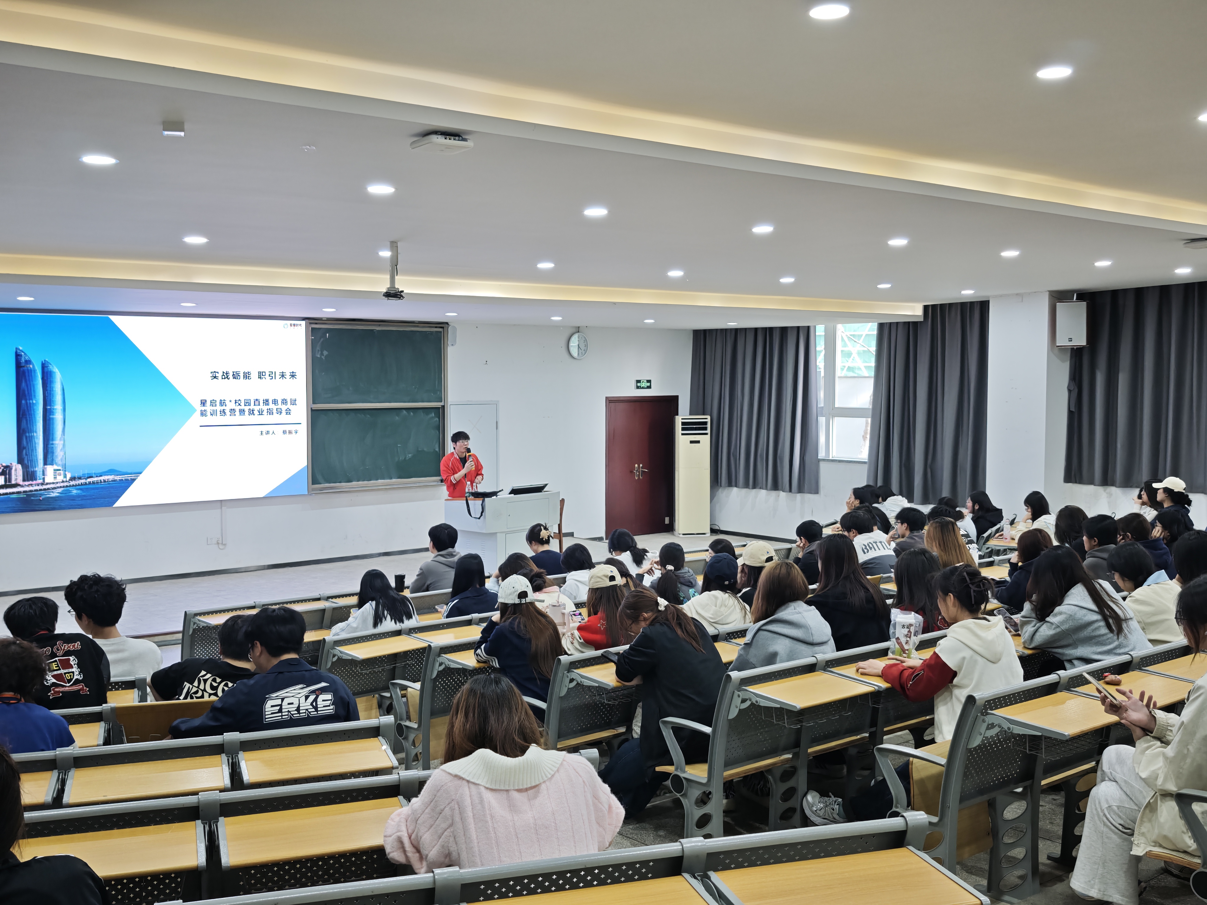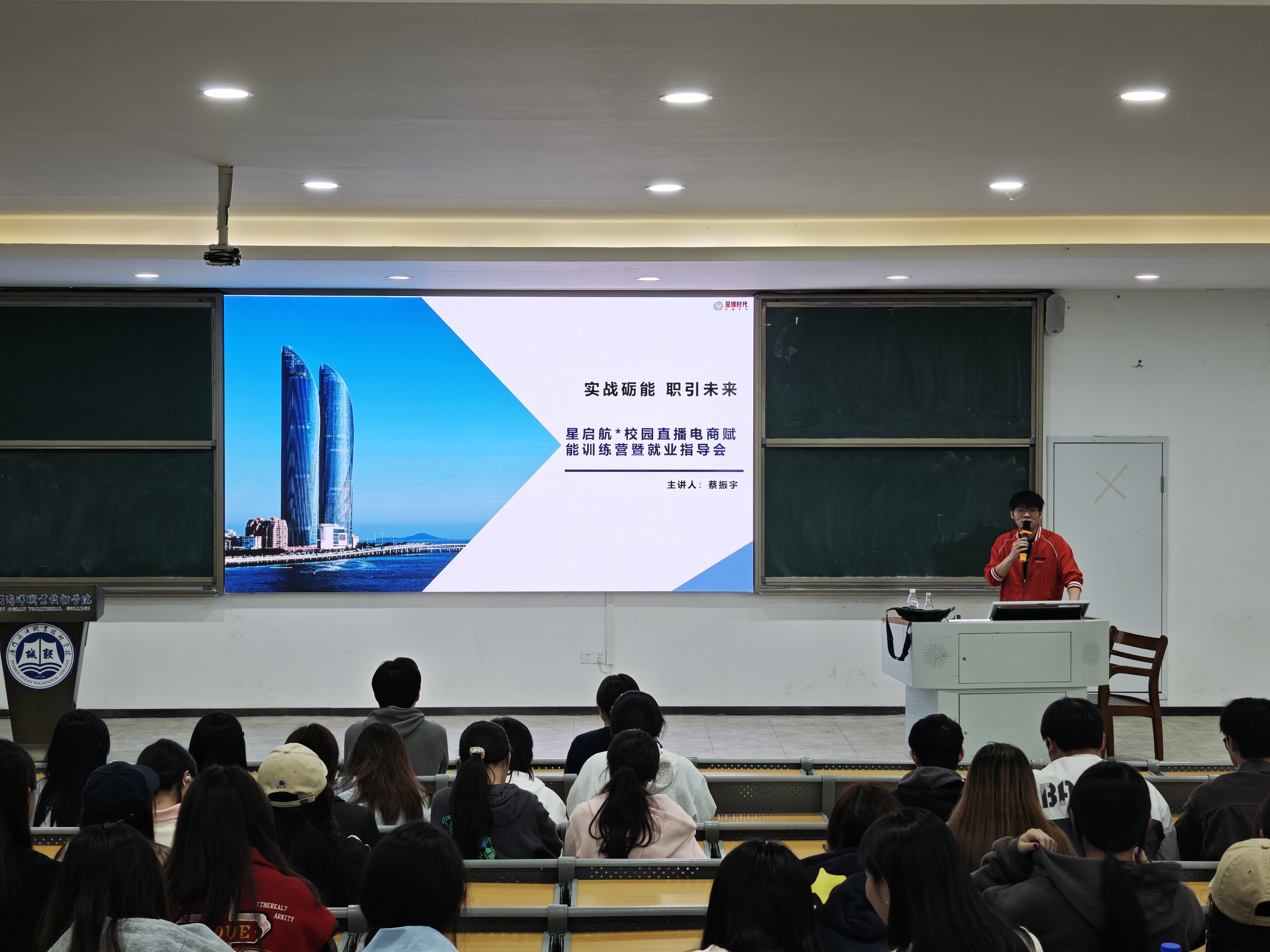 宣讲会由厦门星缘时代传媒有限公司导师蔡振宇主讲。蔡振宇通过产教融合的实际项目经验,深入分析当前直播电商行业现状,结合行业发展趋势,帮助学生明晰职业定位与发展路径;详细介绍企业所需人才的技能体系,鼓励同学在校期间积累各项知识与技能,努力掌握一技之长,以更好走向工作岗位。
