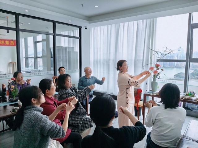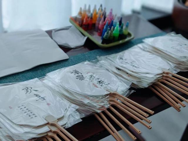现场布置精美雅致,淡雅茶香萦绕。活动邀请非遗传统吉祥绳结技艺第五代传承人、厦门西鼎研学非遗文化研究中心负责人邱丽男大师全程指导。她介绍了绳结和漆扇的历史及技艺背景,详细讲解编绳结和做漆扇的技巧,现场气氛轻松而温馨。老师转换角色做学生,虚心请教,认真学习,灵巧的双手在绳线间穿梭,编织出一件件寓意吉祥的手工饰品。绳结编织完成后,动手制作漆扇,调漆、点染、轻拂,每一把扇子都是瞬间凝结的艺术品,既反映出制作者的心境,也见证了传统文化的传承与创新。