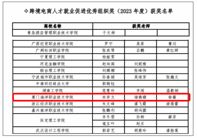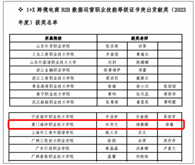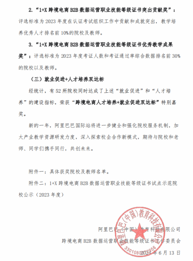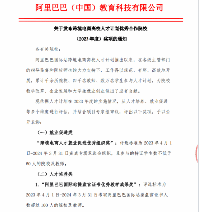 近日,阿里巴巴(中国)教育科技有限公司公布了《关于发布跨境电商高校人才计划优秀合作院校(2023年度)奖项的通知》,我校获“跨境电商人才就业促进优秀组织奖”以及“1+X 跨境电商 B2B 数据运营职业技能等级证书突出贡献奖”2个奖项。
